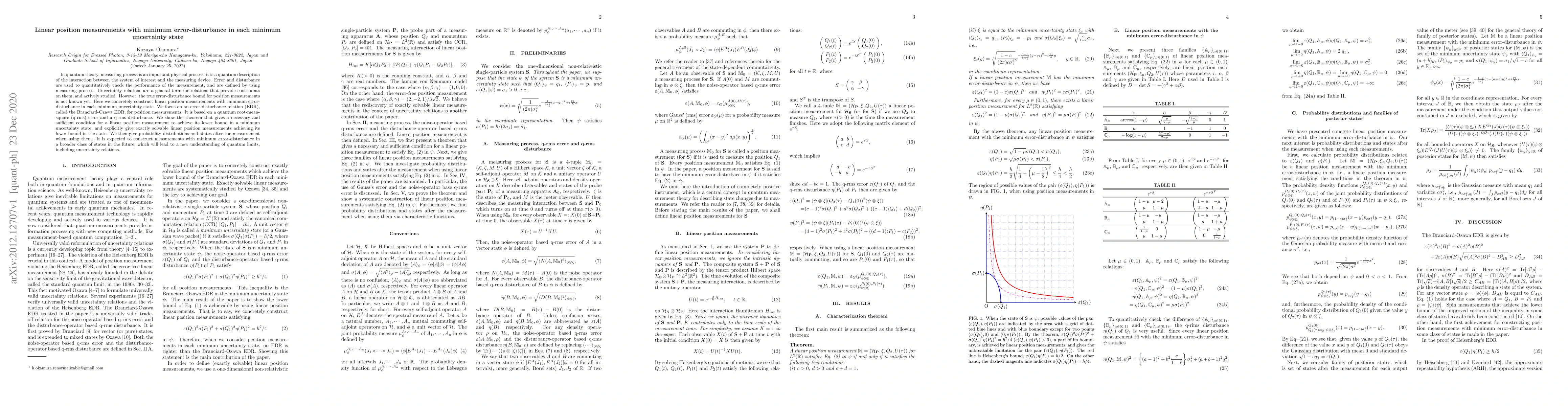 This paper constructs linear position measurements that achieve minimum error-disturbance in each minimum uncertainty state, focusing on the Branciard-Ozawa error-disturbance relation. It provides a theorem establishing necessary and sufficient conditions for these measurements and presents exactly solvable examples, aiming to deepen the understanding of quantum limits and uncertainty relations.