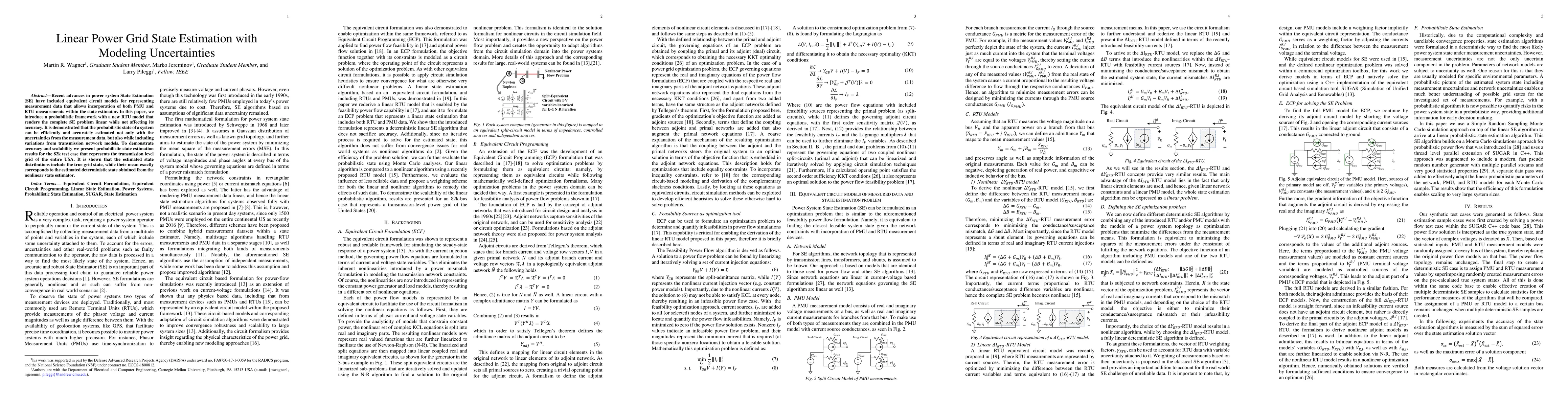 Recent advances in power system State Estimation (SE) have included equivalent circuit models for representing measurement data that allows incorporation of both PMU and RTU measurements within the state estimator. In this paper, we introduce a probabilistic framework with a new RTU model that renders the complete SE problem linear while not affecting its accuracy. It is demonstrated that the probabilistic state of a system can be efficiently and accurately estimated not only with the uncertainties from the measurement data, but also while including variations from transmission network models. To demonstrate accuracy and scalability we present probabilistic state estimation results for the 82k test case that represents the transmission level grid of the entire USA. It is shown that the estimated state distributions include the true grid state, while their mean exactly corresponds to the estimated deterministic state obtained from the nonlinear state estimator.