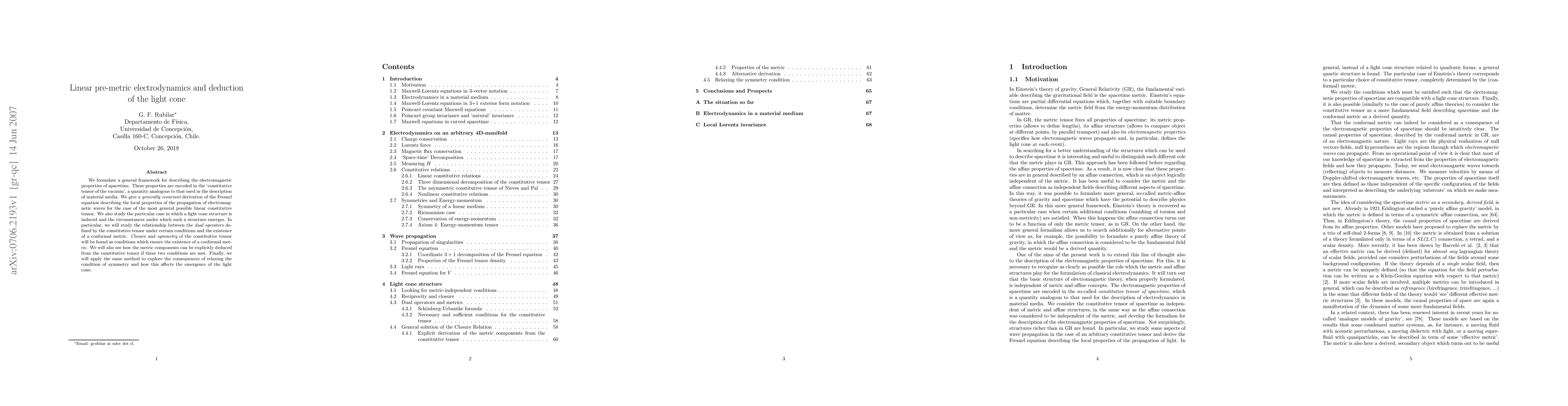 This paper develops a covariant framework for linear pre-metric electrodynamics, deriving the Fresnel equation for electromagnetic wave propagation. It explores conditions under which a conformal metric and light cone structure emerge, particularly focusing on the symmetry and closure of the constitutive tensor.