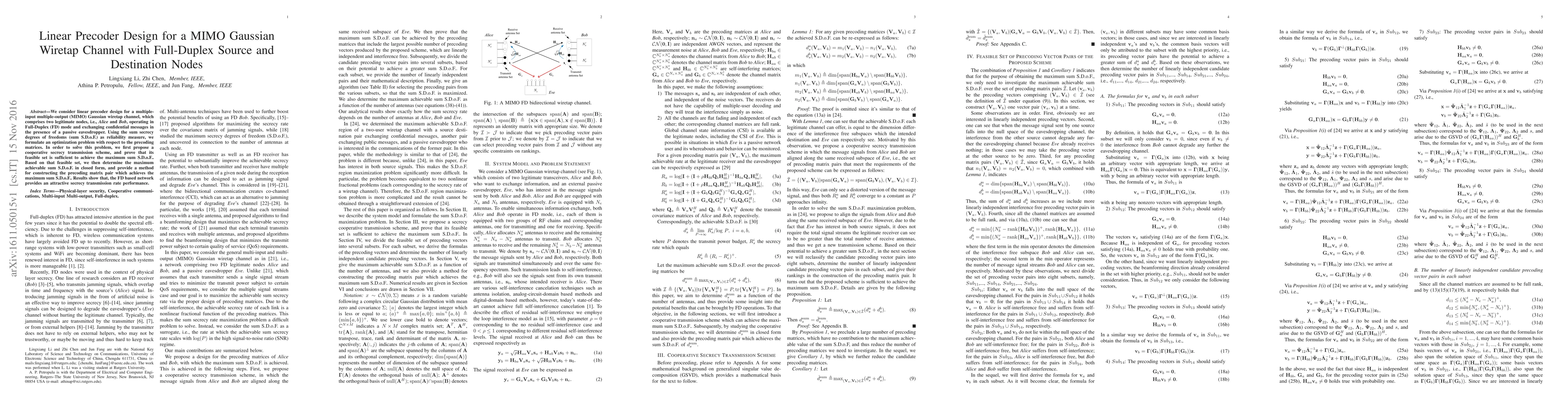 This paper proposes a linear precoder design for a MIMO Gaussian wiretap channel with full-duplex nodes, aiming to maximize the sum secrecy degrees of freedom. It introduces a cooperative transmission scheme and provides a method for constructing precoding matrices that achieve optimal secrecy performance.