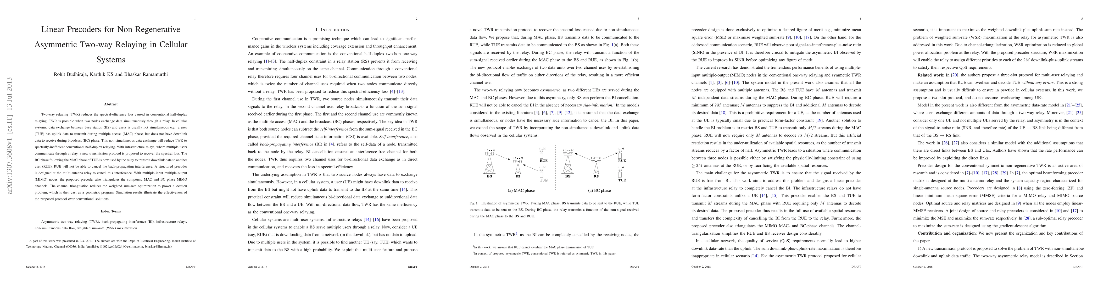 This paper proposes a new transmission protocol for non-regenerative asymmetric two-way relaying in cellular systems to mitigate spectral efficiency loss. A structured precoder at the relay is designed to cancel interference and triangulate MIMO channels, transforming the optimization problem into a geometric program, which is shown to outperform conventional methods.