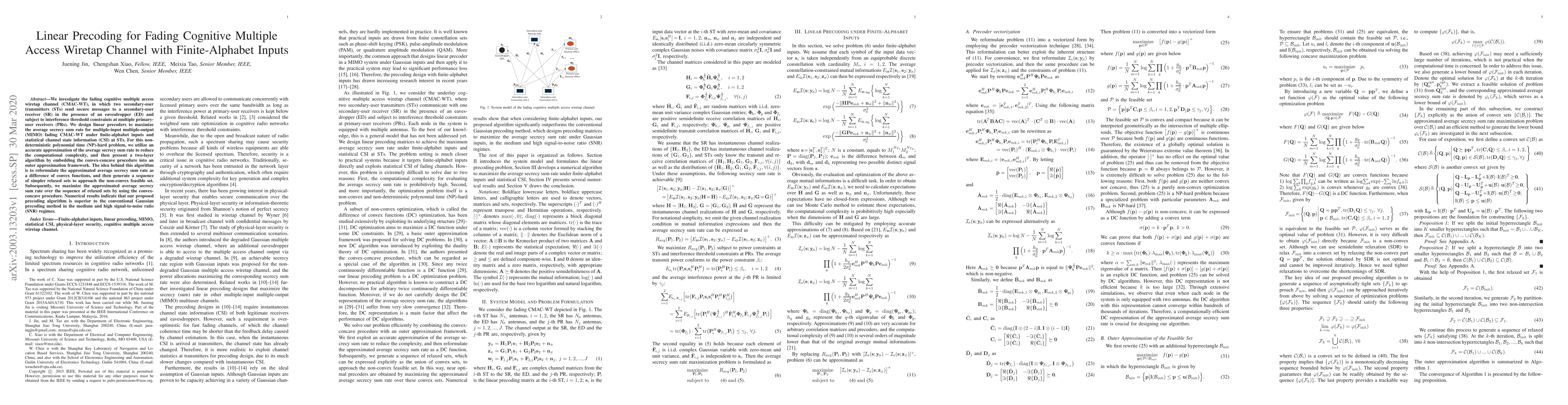 We investigate the fading cognitive multiple access wiretap channel (CMAC-WT), in which two secondary-user transmitters (STs) send secure messages to a secondary-user receiver (SR) in the presence of an eavesdropper (ED) and subject to interference threshold constraints at multiple primary-user receivers (PRs). We design linear precoders to maximize the average secrecy sum rate for multiple-input multiple-output (MIMO) fading CMAC-WT under finite-alphabet inputs and statistical channel state information (CSI) at STs. For this non-deterministic polynomial time (NP)-hard problem, we utilize an accurate approximation of the average secrecy sum rate to reduce the computational complexity, and then present a two-layer algorithm by embedding the convex-concave procedure into an outer approximation framework. The idea behind this algorithm is to reformulate the approximated average secrecy sum rate as a difference of convex functions, and then generate a sequence of simpler relaxed sets to approach the non-convex feasible set. Subsequently, we maximize the approximated average secrecy sum rate over the sequence of relaxed sets by using the convex-concave procedure. Numerical results indicate that our proposed precoding algorithm is superior to the conventional Gaussian precoding method in the medium and high signal-to-noise ratio (SNR) regimes.