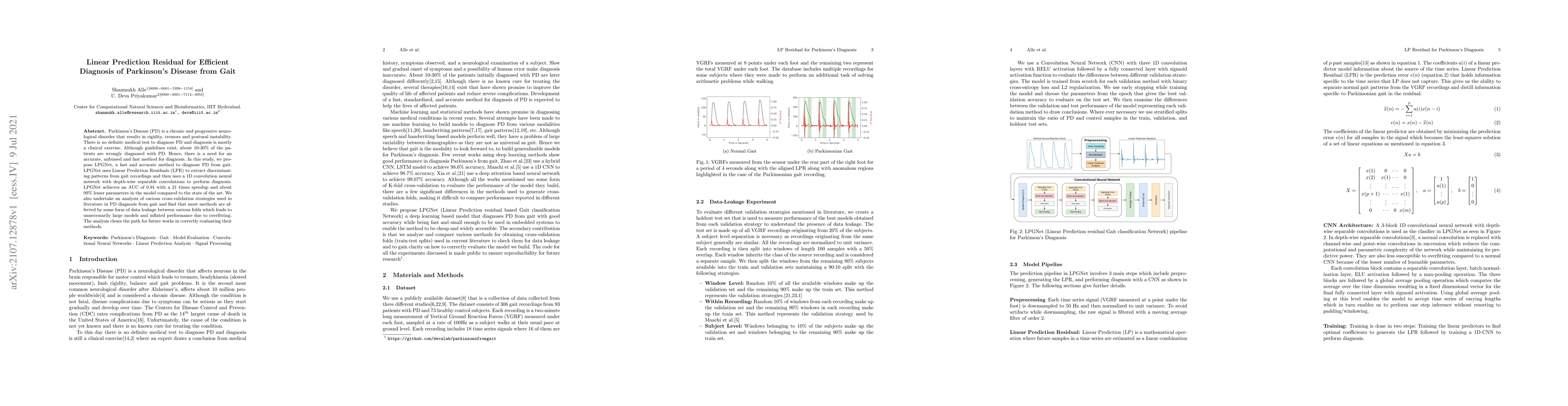 Parkinson's Disease (PD) is a chronic and progressive neurological disorder that results in rigidity, tremors and postural instability. There is no definite medical test to diagnose PD and diagnosis is mostly a clinical exercise. Although guidelines exist, about 10-30% of the patients are wrongly diagnosed with PD. Hence, there is a need for an accurate, unbiased and fast method for diagnosis. In this study, we propose LPGNet, a fast and accurate method to diagnose PD from gait. LPGNet uses Linear Prediction Residuals (LPR) to extract discriminating patterns from gait recordings and then uses a 1D convolution neural network with depth-wise separable convolutions to perform diagnosis. LPGNet achieves an AUC of 0.91 with a 21 times speedup and about 99% lesser parameters in the model compared to the state of the art. We also undertake an analysis of various cross-validation strategies used in literature in PD diagnosis from gait and find that most methods are affected by some form of data leakage between various folds which leads to unnecessarily large models and inflated performance due to overfitting. The analysis clears the path for future works in correctly evaluating their methods.