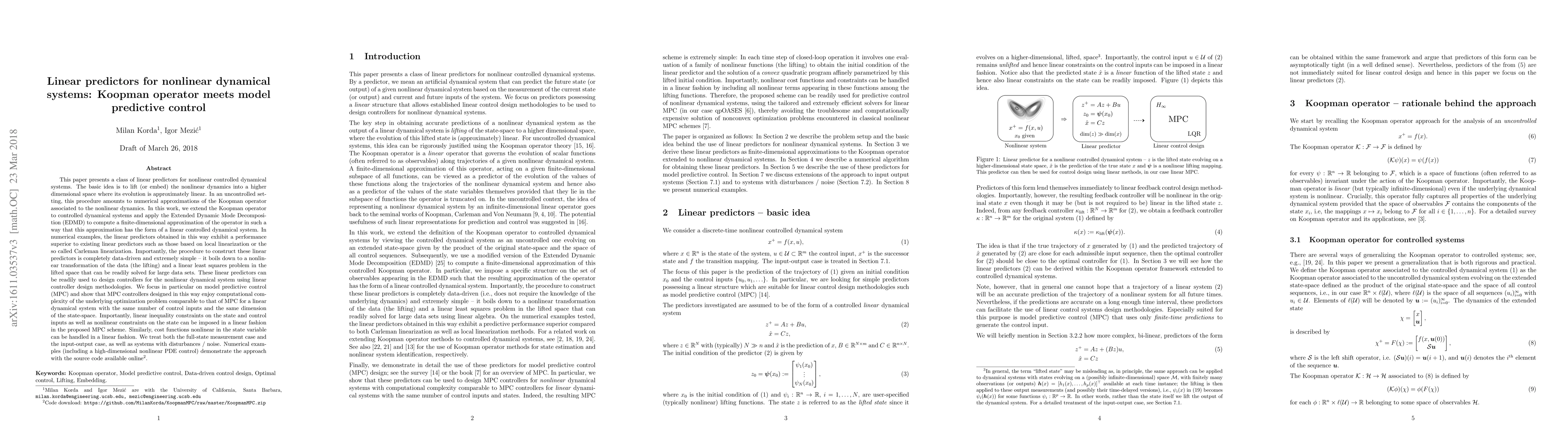 This paper introduces linear predictors for nonlinear dynamical systems by leveraging the Koopman operator, transforming nonlinear dynamics into an approximately linear form in a higher-dimensional space. These predictors enable efficient model predictive control (MPC) with computational complexity comparable to linear MPC, handling both linear and nonlinear constraints effectively.