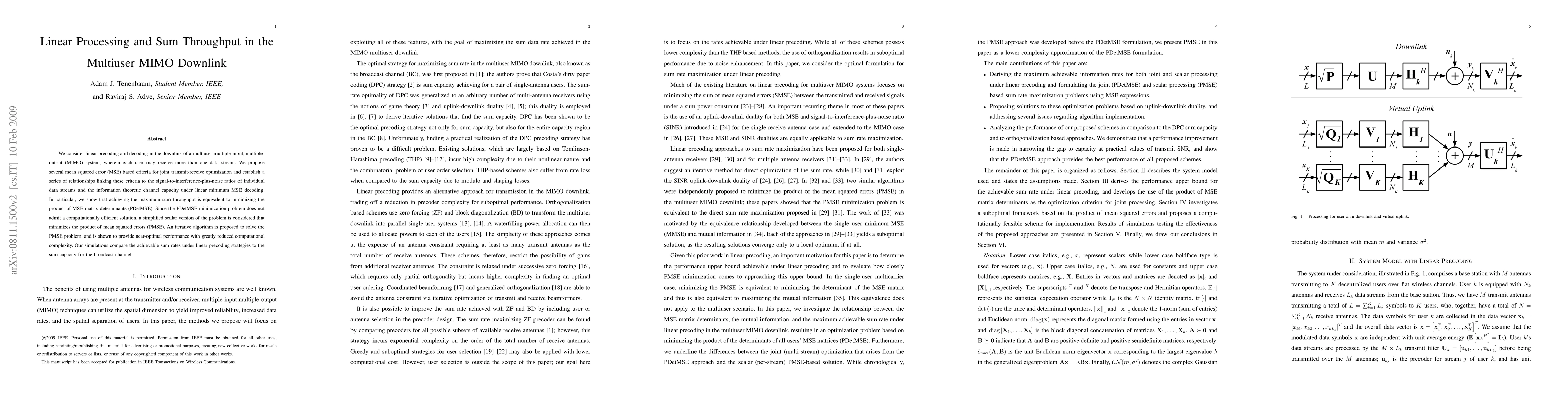 The paper proposes a method to optimize sum throughput in multiuser MIMO downlink systems using linear precoding and decoding. It shows that minimizing the product of mean squared errors can achieve maximum sum throughput with reduced computational complexity.