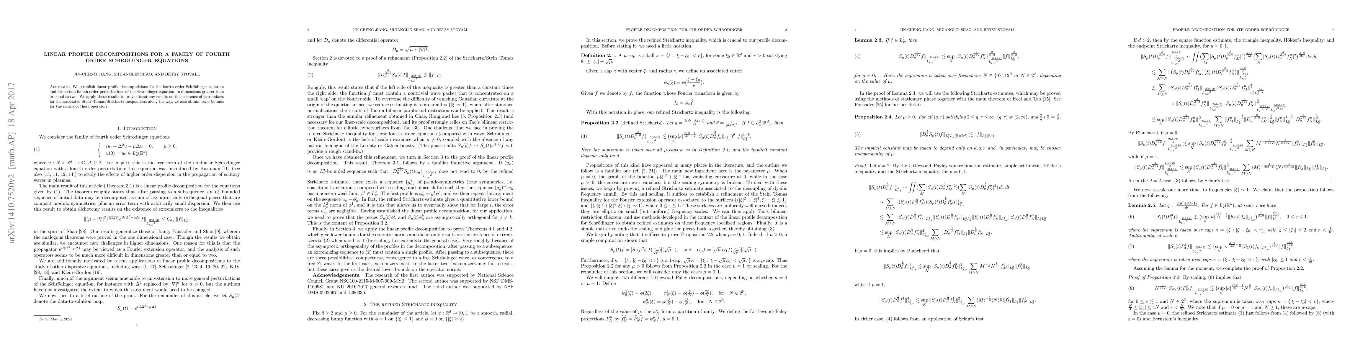 We establish linear profile decompositions for the fourth order Schr\"odinger equation and for certain fourth order perturbations of the Schr\"odinger equation, in dimensions greater than or equal to two. We apply these results to prove dichotomy results on the existence of extremizers for the associated Stein--Tomas/Strichartz inequalities; along the way, we also obtain lower bounds for the norms of these operators.