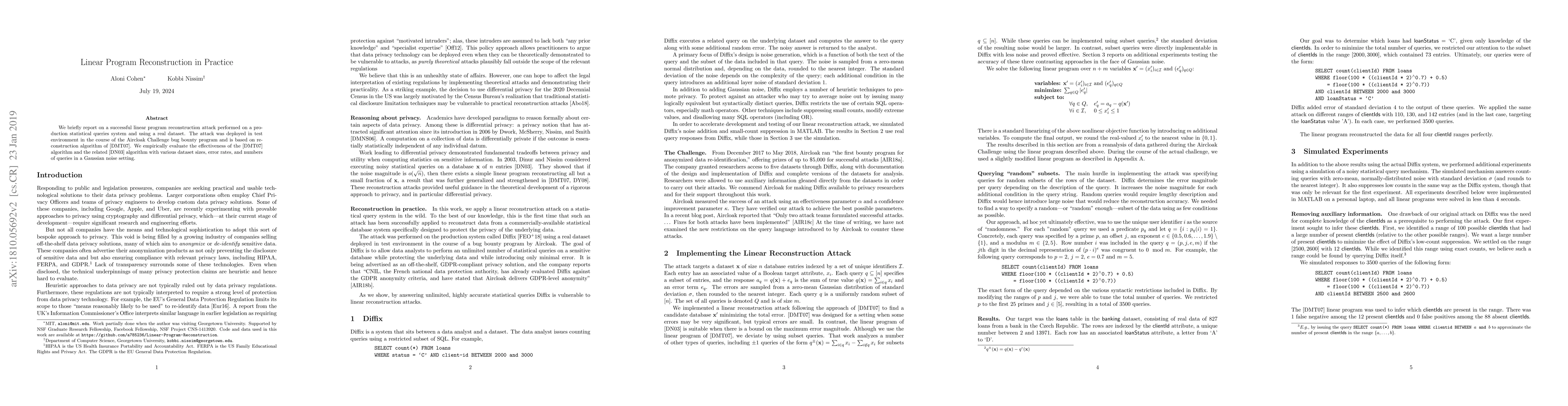 We briefly report on a successful linear program reconstruction attack performed on a production statistical queries system and using a real dataset. The attack was deployed in test environment in the course of the Aircloak Challenge bug bounty program and is based on the reconstruction algorithm of Dwork, McSherry, and Talwar. We empirically evaluate the effectiveness of the algorithm and a related algorithm by Dinur and Nissim with various dataset sizes, error rates, and numbers of queries in a Gaussian noise setting.