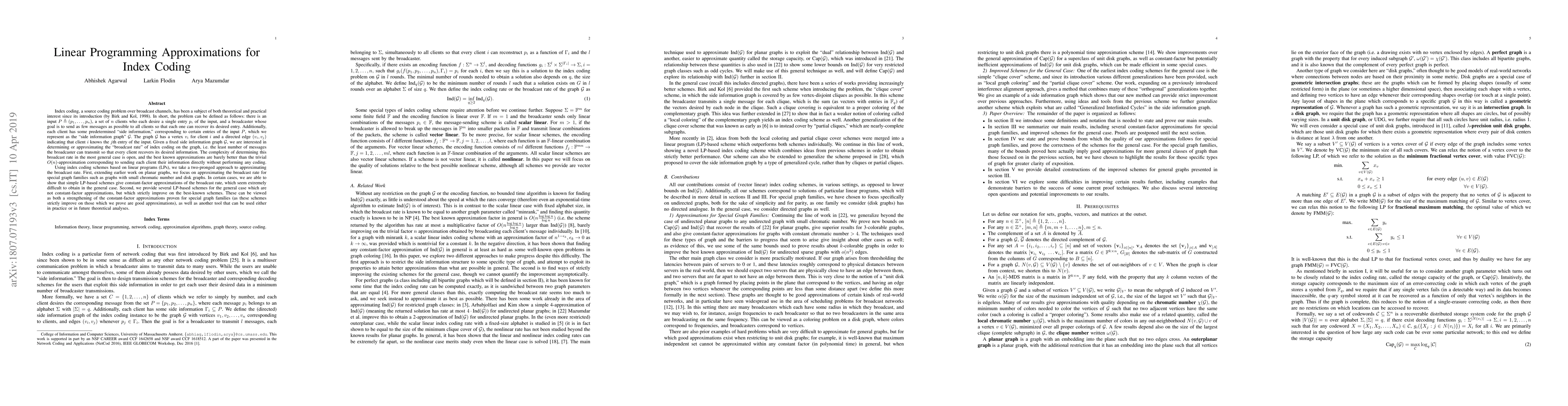 This paper explores linear programming (LP) approximations for index coding over broadcast channels, focusing on minimizing the number of messages needed for clients to retrieve their desired symbols given side information. It presents LP-based schemes that provide constant-factor approximations for specific graph families and improvements over existing methods for general cases.