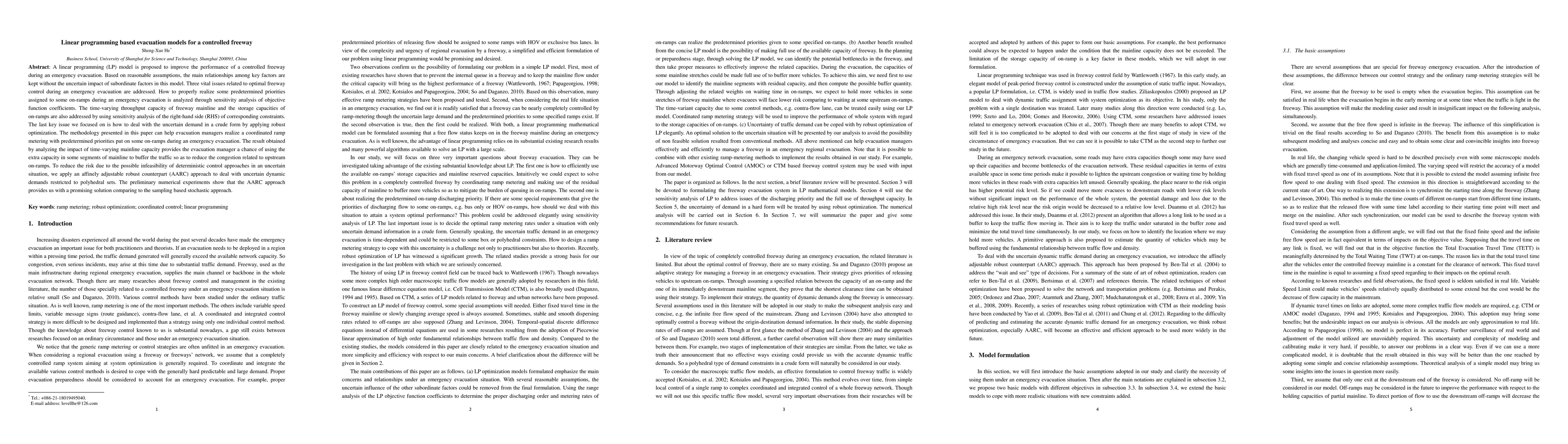 A linear programming (LP) model is proposed to improve the performance of a controlled freeway during an emergency evacuation. Based on reasonable assumptions, the main relationships among key factors are kept without the uncertain impact of subordinate factors in this model. Three vital issues related to optimal freeway control during an emergency evacuation are addressed. How to properly realize some predetermined priorities assigned to some on-ramps during an emergency evacuation is analyzed through sensitivity analysis of objective function coefficients. The time-varying throughput capacity of freeway mainline and the storage capacities of on-ramps are also addressed by using sensitivity analysis of the right-hand side (RHS) of corresponding constraints. The last key issue we focused on is how to deal with the uncertain demand in a crude form by applying robust optimization. The methodology presented in this paper can help evacuation managers realize a coordinated ramp metering with predetermined priorities put on some on-ramps during an emergency evacuation. The result obtained by analyzing the impact of time-varying mainline capacity provides the evacuation manager a chance of using the extra capacity in some segments of mainline to buffer the traffic so as to reduce the congestion related to upstream on-ramps. To reduce the risk due to the possible infeasibility of deterministic control approaches in an uncertain situation, we apply an affinely adjustable robust counterpart (AARC) approach to deal with uncertain dynamic demands restricted to polyhedral sets. The preliminary numerical experiments show that the AARC approach provides us with a promising solution comparing to the sampling based stochastic approach.