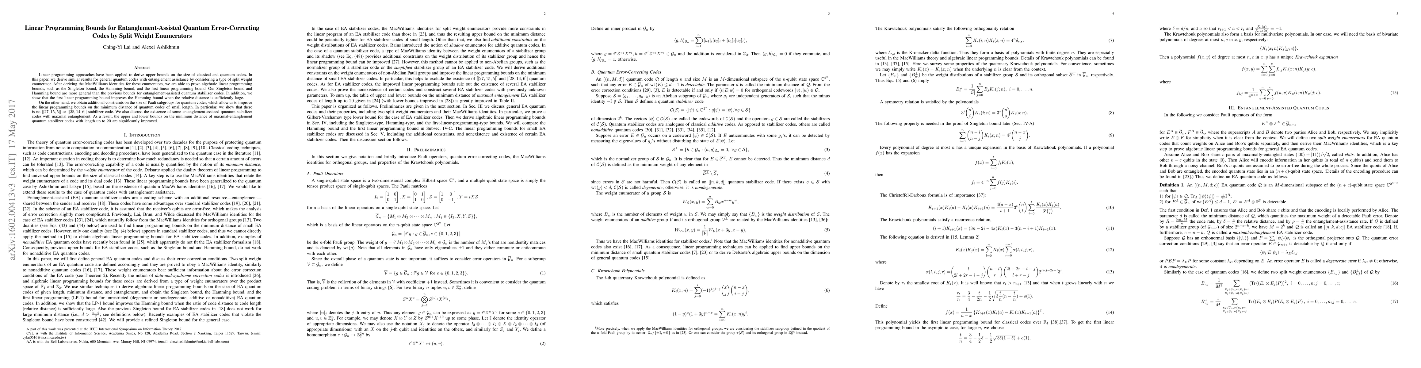 Linear programming approaches have been applied to derive upper bounds on the size of classical codes and quantum codes. In this paper, we derive similar results for general quantum codes with entanglement assistance, including nonadditive codes, by considering a type of split weight enumerators. After deriving the MacWilliams identities for these split weight enumerators, we are able to prove algebraic linear programming bounds, such as the Singleton bound, the Hamming bound, and the first linear programming bound. In particular, we show that the first linear programming bound improves the Hamming bound when the relative distance is sufficiently large. On the other hand, we obtain additional constraints on the size of Pauli subgroups for quantum codes, which allow us to improve the linear programming bounds on the minimum distance of small quantum codes. In particular, we show that there is no [[27,15,5]] or [[28,14,6]] quantum stabilizer code. We also discuss the existence of some entanglement-assisted quantum stabilizer codes with maximal entanglement. As a result, the upper and lower bounds on the minimum distance of maximal-entanglement quantum stabilizer codes with length up to 20 are significantly improved.