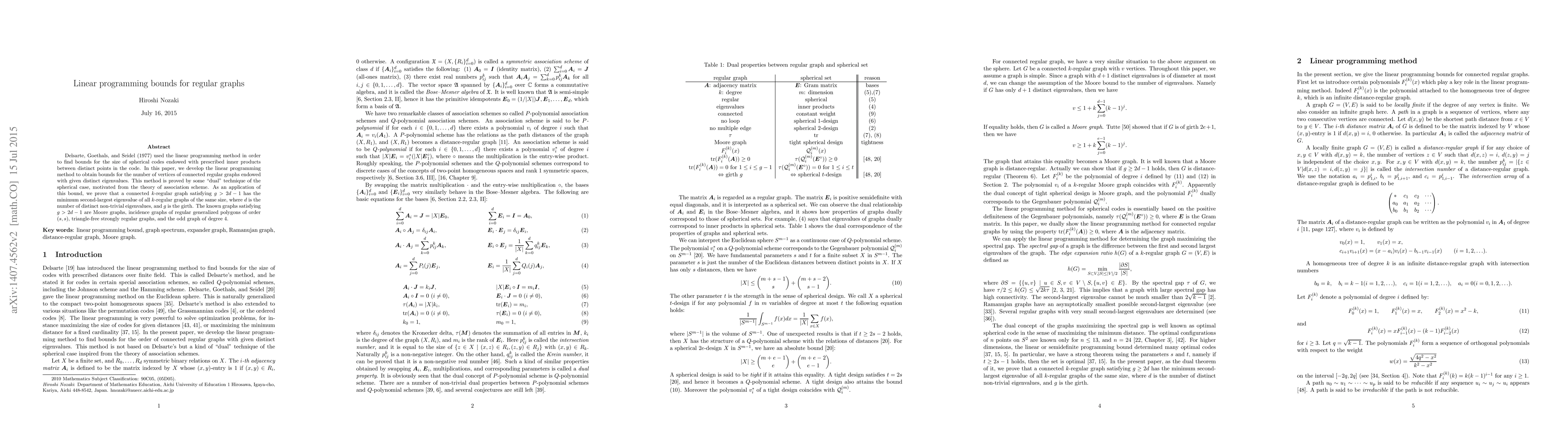 Delsarte, Goethals, and Seidel (1977) used the linear programming method in order to find bounds for the size of spherical codes endowed with prescribed inner products between distinct points in the code. In this paper, we develop the linear programming method to obtain bounds for the number of vertices of connected regular graphs endowed with given distinct eigenvalues. This method is proved by some "dual" technique of the spherical case, motivated from the theory of association scheme. As an application of this bound, we prove that a connected $k$-regular graph satisfying $g>2d-1$ has the minimum second-largest eigenvalue of all $k$-regular graphs of the same size, where $d$ is the number of distinct non-trivial eigenvalues, and $g$ is the girth. The known graphs satisfying $g>2d-1$ are Moore graphs, incidence graphs of regular generalized polygons of order $(s,s)$, triangle-free strongly regular graphs, and the odd graph of degree $4$.
