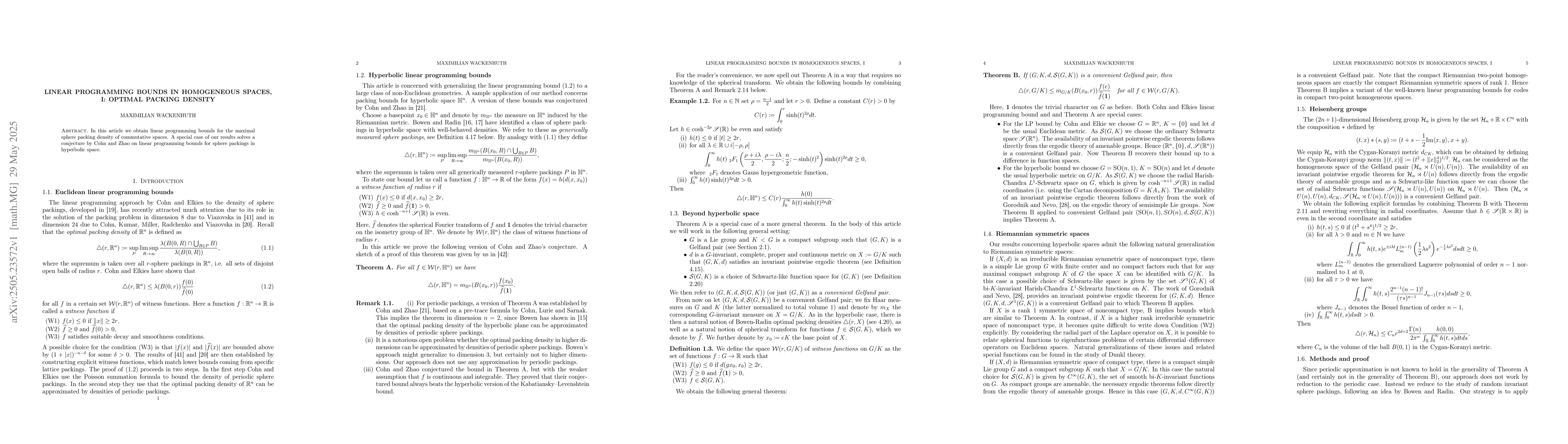 Researchers derived linear programming bounds for the densest sphere packing in commutative spaces, solving a conjecture on hyperbolic space packings.