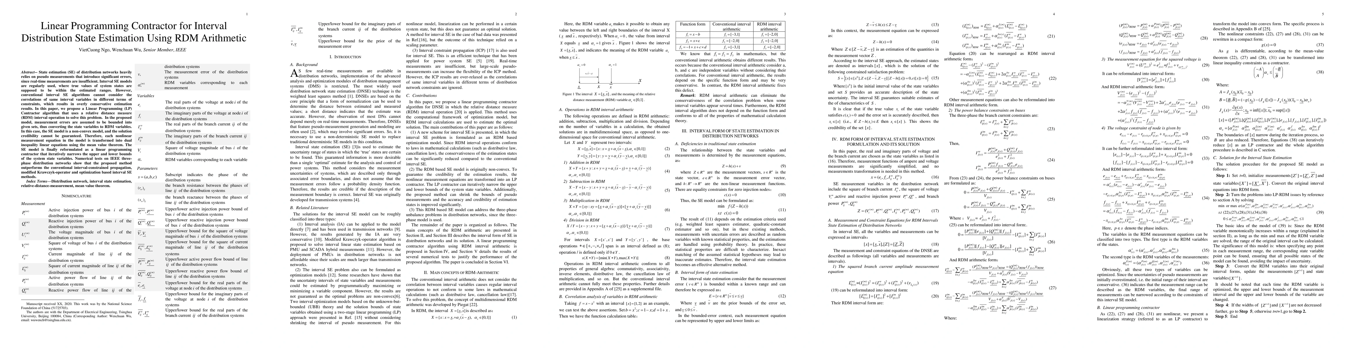 This paper proposes a Linear Programming Contractor algorithm using relative distance measure (RDM) arithmetic to improve interval state estimation in distribution networks. The method iteratively narrows bounds on state variables, outperforming conventional methods in numerical tests on IEEE networks.
