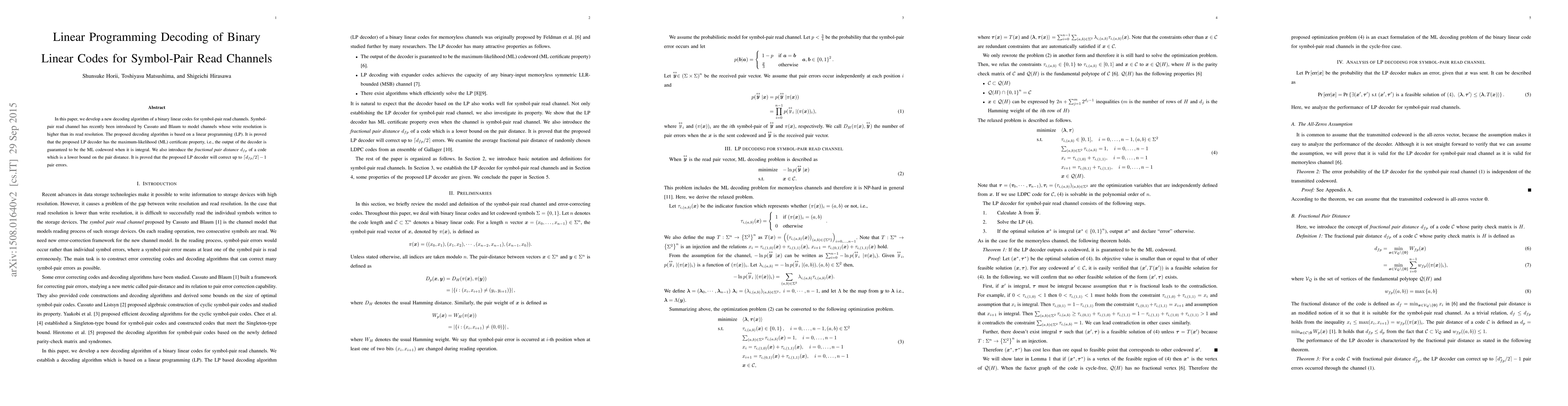 This paper presents a linear programming decoding algorithm for binary linear codes in symbol-pair read channels, which model channels with high write but low read resolution. The proposed algorithm guarantees maximum-likelihood decoding when the output is integral and corrects up to $\lceil d_{fp}/2\rceil-1$ pair errors.