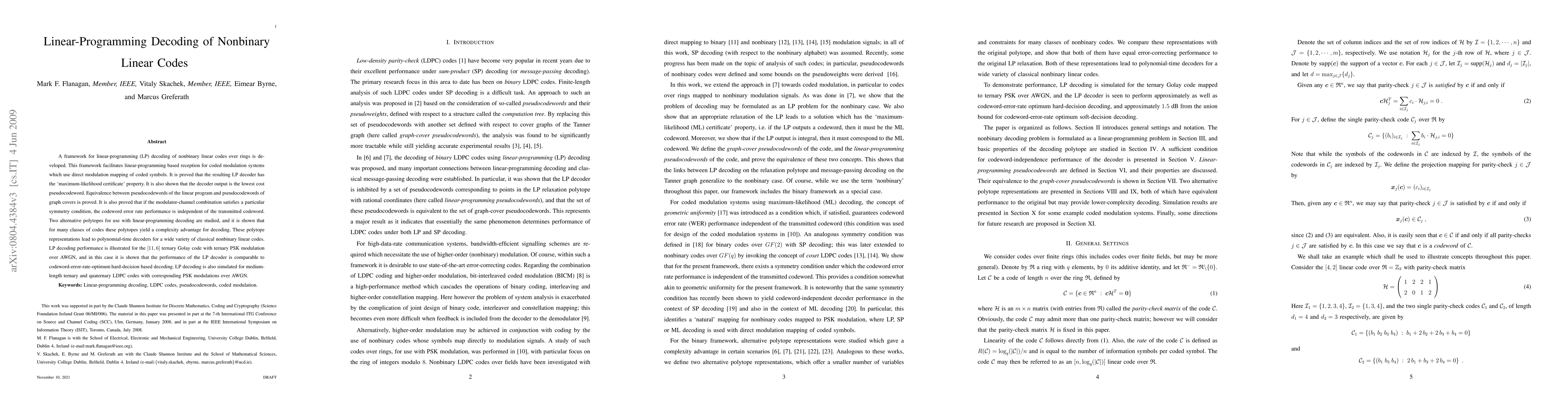 A framework for linear-programming (LP) decoding of nonbinary linear codes over rings is developed. This framework facilitates linear-programming based reception for coded modulation systems which use direct modulation mapping of coded symbols. It is proved that the resulting LP decoder has the 'maximum-likelihood certificate' property. It is also shown that the decoder output is the lowest cost pseudocodeword. Equivalence between pseudocodewords of the linear program and pseudocodewords of graph covers is proved. It is also proved that if the modulator-channel combination satisfies a particular symmetry condition, the codeword error rate performance is independent of the transmitted codeword. Two alternative polytopes for use with linear-programming decoding are studied, and it is shown that for many classes of codes these polytopes yield a complexity advantage for decoding. These polytope representations lead to polynomial-time decoders for a wide variety of classical nonbinary linear codes. LP decoding performance is illustrated for the [11,6] ternary Golay code with ternary PSK modulation over AWGN, and in this case it is shown that the performance of the LP decoder is comparable to codeword-error-rate-optimum hard-decision based decoding. LP decoding is also simulated for medium-length ternary and quaternary LDPC codes with corresponding PSK modulations over AWGN.
