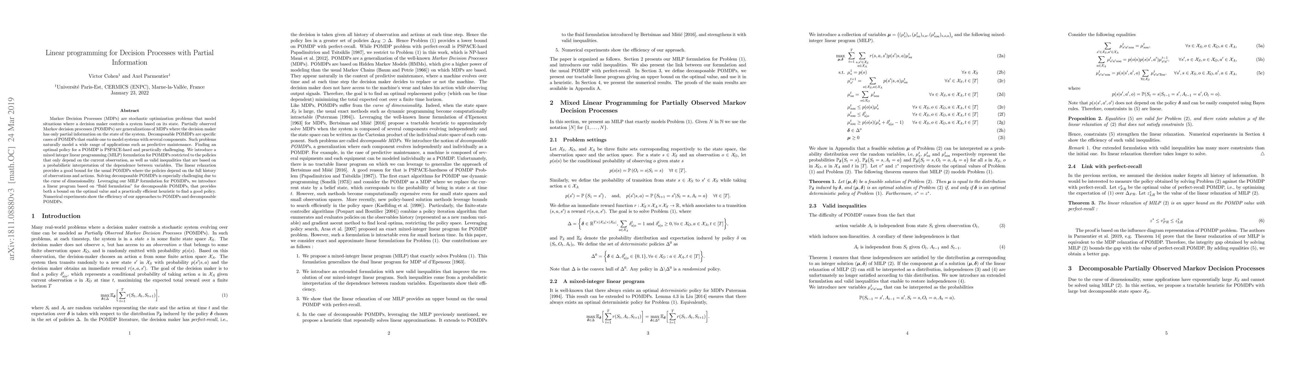 Markov Decision Processes (MDPs) are stochastic optimization problems that model situations where a decision maker controls a system based on its state. Partially observed Markov decision processes (POMDPs) are generalizations of MDPs where the decision maker has only partial information on the state of the system. Decomposable POMDPs are specific cases of POMDPs that enable one to model systems with several components. Such problems naturally model a wide range of applications such as predictive maintenance. Finding an optimal policy for a POMDP is PSPACE-hard and practically challenging. We introduce a mixed integer linear programming (MILP) formulation for POMDPs restricted to the policies that only depend on the current observation, as well as valid inequalities that are based on a probabilistic interpretation of the dependence between variables. The linear relaxation provides a good bound for the usual POMDPs where the policies depend on the full history of observations and actions. Solving decomposable POMDPs is especially challenging due to the curse of dimensionality. Leveraging our MILP formulation for POMDPs, we introduce a linear program based on ``fluid formulation'' for decomposable POMDPs, that provides both a bound on the optimal value and a practically efficient heuristic to find a good policy. Numerical experiments show the efficiency of our approaches to POMDPs and decomposable POMDPs.