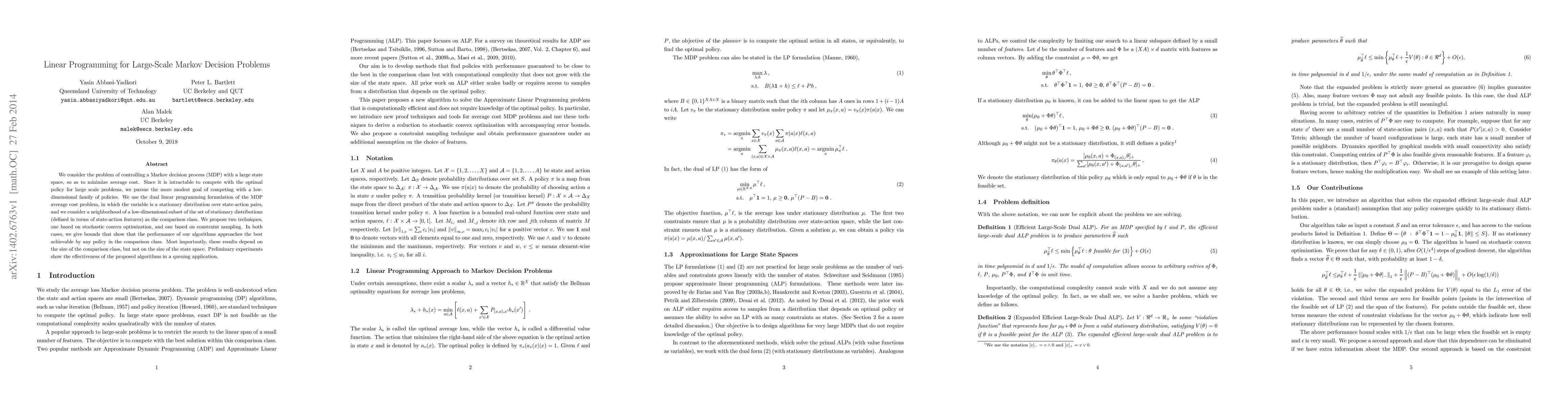This paper proposes two algorithms for solving large-scale Markov decision problems using linear programming, with a focus on competing with low-dimensional policies, and shows that their performance approaches the best achievable by any policy in the comparison class.