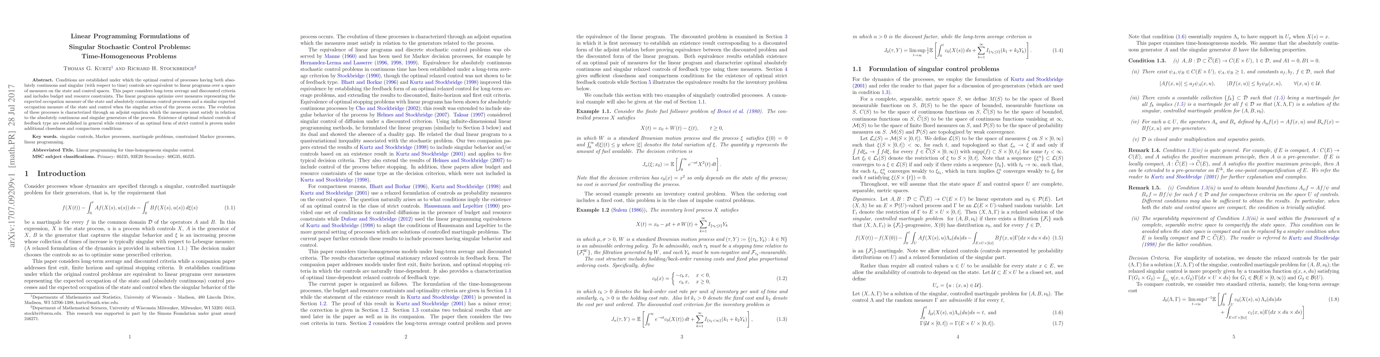 Conditions are established under which the optimal control of processes having both absolutely continuous and singular (with respect to time) controls are equivalent to linear programs over a space of measures on the state and control spaces. This paper considers long-term average and discounted criteria and includes budget and resource constraints. The linear programs optimize over measures representing the expected occupation measure of the state and absolutely continuous control processes and a similar expected occupation measure of the state and control when the singular action of the process occurs. The evolution of these processes is characterized through an adjoint equation which the measures must satisfy in relation to the absolutely continuous and singular generators of the process. Existence of optimal relaxed controls of feedback type are established in general while existence of an optimal form of strict control is proven under additional closedness and compactness conditions.
