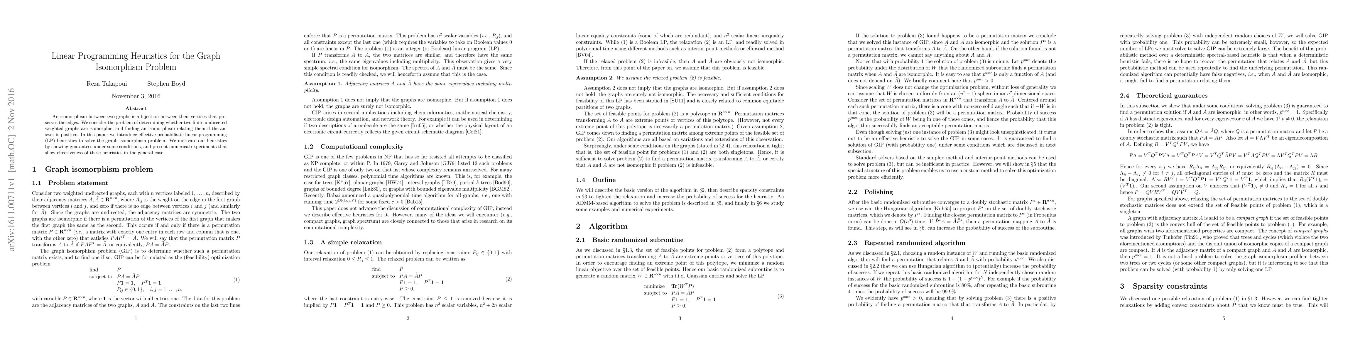 This paper introduces probabilistic linear programming heuristics to determine if two finite undirected weighted graphs are isomorphic and to find an isomorphism if they are. The authors provide theoretical guarantees under certain conditions and demonstrate the heuristics' effectiveness through numerical experiments.