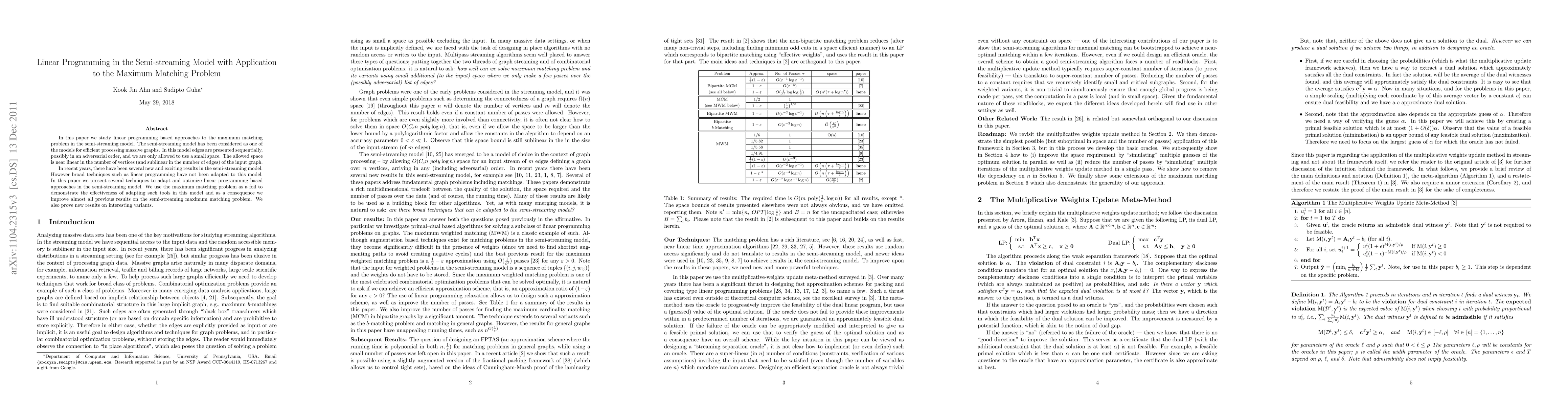 This paper adapts linear programming techniques to the semi-streaming model for solving the maximum matching problem, improving upon existing results and introducing new optimizations. The study highlights the model's relevance for processing massive graphs by efficiently handling edge streams within a limited space.