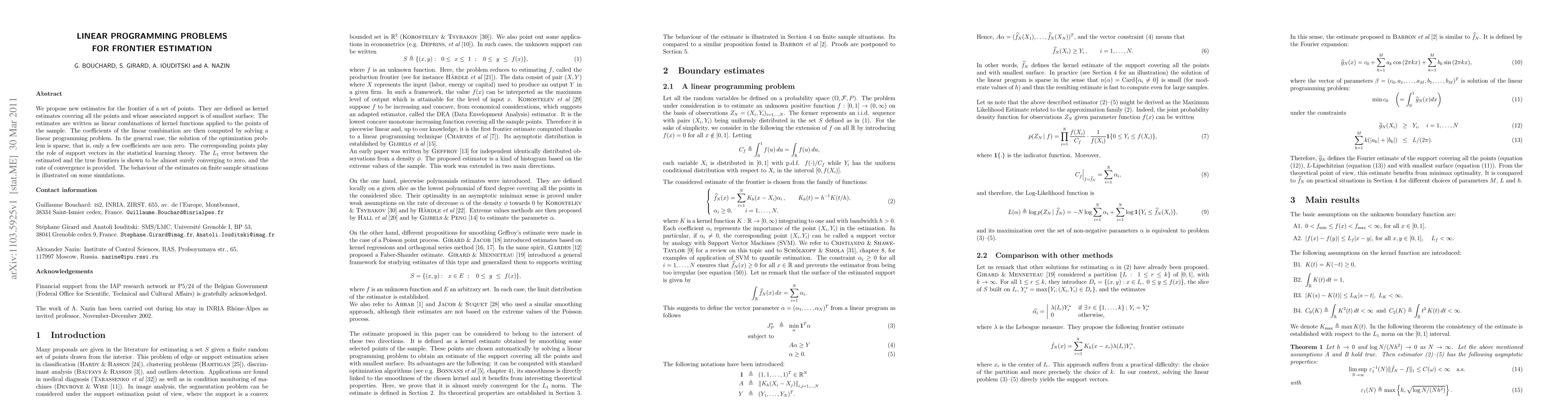 We propose new estimates for the frontier of a set of points. They are defined as kernel estimates covering all the points and whose associated support is of smallest surface. The estimates are written as linear combinatio- ns of kernel functions applied to the points of the sample. The coefficients of the linear combination are then computed by solving a linear programming problem. In the general case, the solution of the optimizat- ion problem is sparse, that is, only a few coefficients are non zero. The corresponding points play the role of support vectors in the statistical learning theory. The L_1 error between the estimated and the true frontiers is shown to be almost surely converging to zero, and the rate of convergence is provided. The behaviour of the estimates on finite sample situations is illustrated on some simulations.