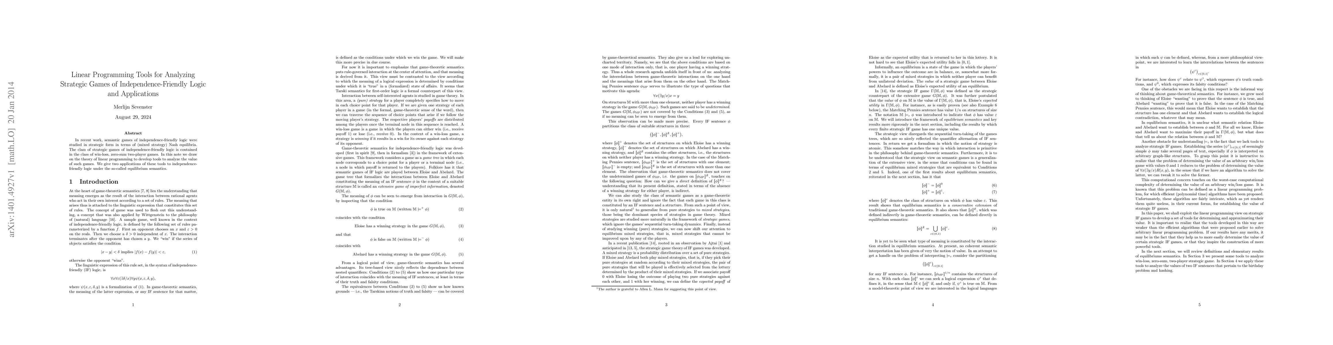 This paper utilizes linear programming to analyze strategic games of independence-friendly logic, focusing on mixed strategy Nash equilibria. It presents two applications of these tools to understand the value of such games under equilibrium semantics.