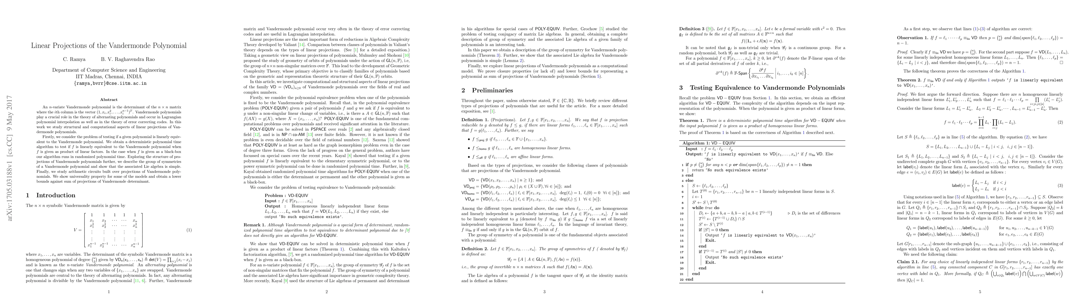 This paper investigates linear projections of n-variate Vandermonde polynomials, focusing on their structural and computational properties. It presents a deterministic polynomial-time algorithm to test linear equivalence of given polynomials to the Vandermonde polynomial when decomposed into linear factors, and a randomized polynomial-time algorithm for black-box polynomials. It also explores the symmetries and associated Lie algebra of Vandermonde polynomials, proving the simplicity of the latter.