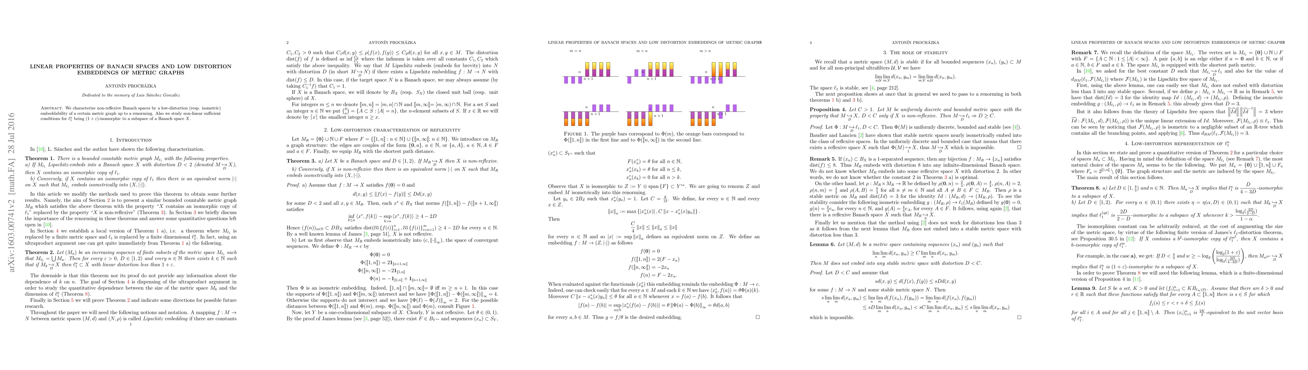 This paper investigates the linear properties of non-reflexive Banach spaces through low-distortion embeddings of metric graphs and explores sufficient non-linear conditions for $\ell_1^n$ to be $(1+\varepsilon)$-isomorphic to a subspace of another Banach space $X$.