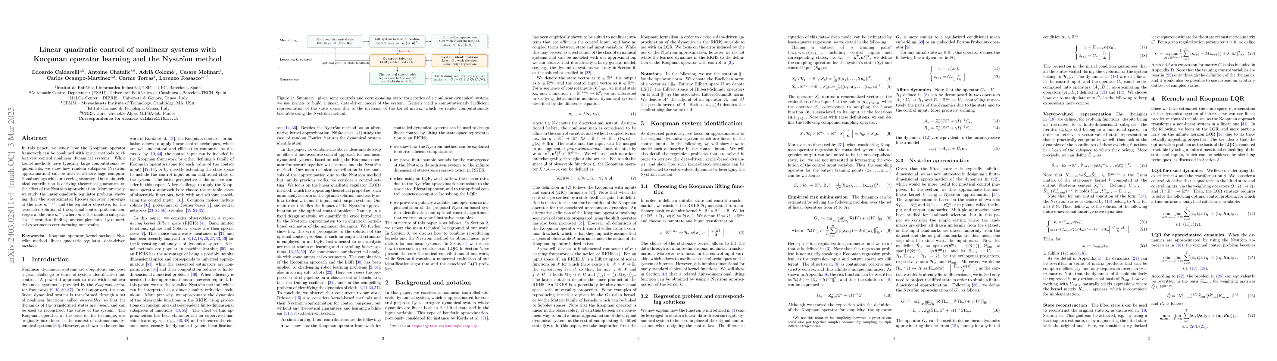 In this paper, we study how the Koopman operator framework can be combined with kernel methods to effectively control nonlinear dynamical systems. While kernel methods have typically large computational requirements, we show how random subspaces (Nystr\"om approximation) can be used to achieve huge computational savings while preserving accuracy. Our main technical contribution is deriving theoretical guarantees on the effect of the Nystr\"om approximation. More precisely, we study the linear quadratic regulator problem, showing that both the approximated Riccati operator and the regulator objective, for the associated solution of the optimal control problem, converge at the rate $m^{-1/2}$, where $m$ is the random subspace size. Theoretical findings are complemented by numerical experiments corroborating our results.