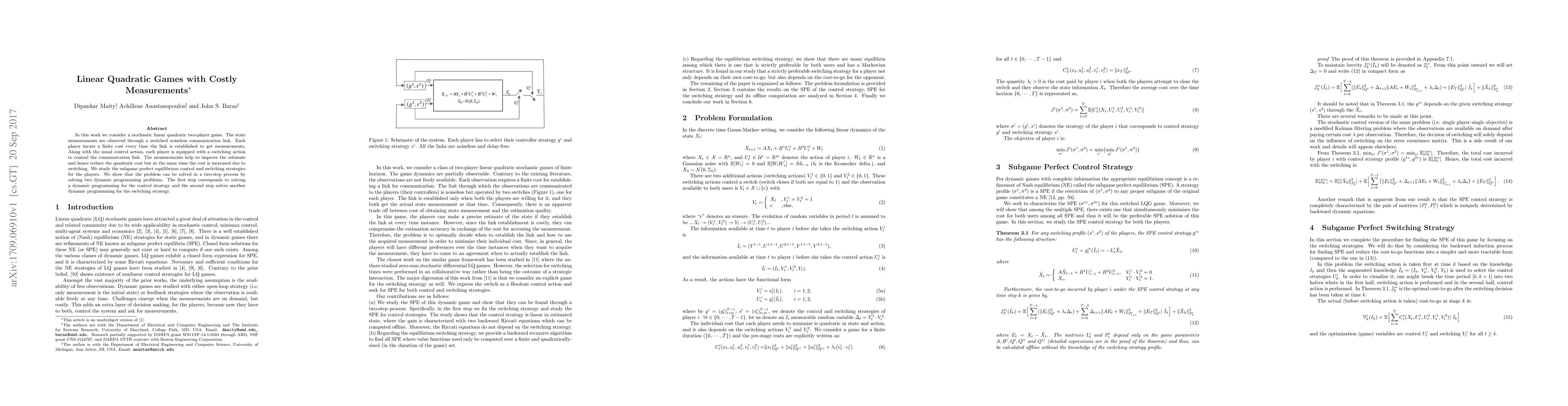 The research employs dynamic programming and backward induction to solve a stochastic linear quadratic two-player game with costly measurements and a switched noiseless communication link.