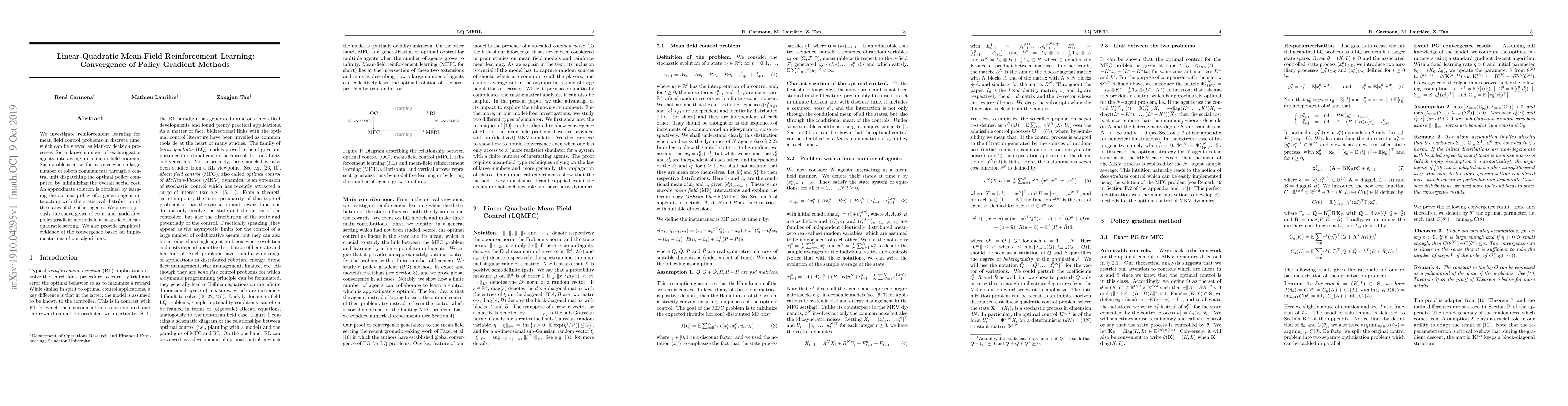 This paper investigates reinforcement learning for large-scale mean field control problems in discrete time, proving the convergence of exact and model-free policy gradient methods in a linear-quadratic setting. The study also provides graphical evidence of algorithm convergence through practical implementations.