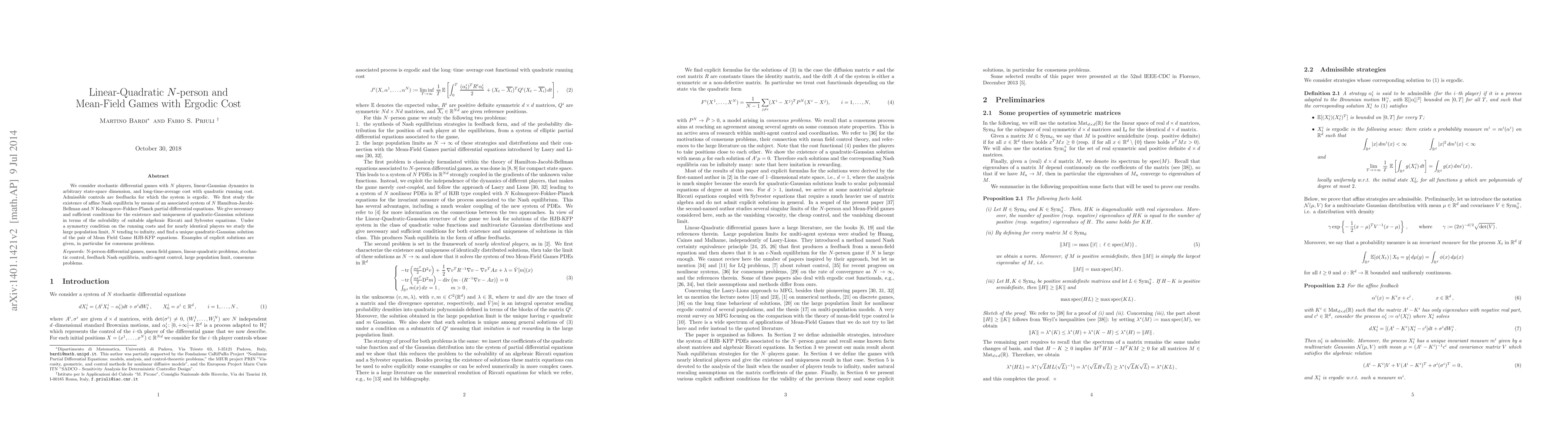 We consider stochastic differential games with $N$ players, linear-Gaussian dynamics in arbitrary state-space dimension, and long-time-average cost with quadratic running cost. Admissible controls are feedbacks for which the system is ergodic. We first study the existence of affine Nash equilibria by means of an associated system of $N$ Hamilton-Jacobi-Bellman and $N$ Kolmogorov-Fokker-Planck partial differential equations. We give necessary and sufficient conditions for the existence and uniqueness of quadratic-Gaussian solutions in terms of the solvability of suitable algebraic Riccati and Sylvester equations. Under a symmetry condition on the running costs and for nearly identical players we study the large population limit, $N$ tending to infinity, and find a unique quadratic-Gaussian solution of the pair of Mean Field Game HJB-KFP equations. Examples of explicit solutions are given, in particular for consensus problems.
