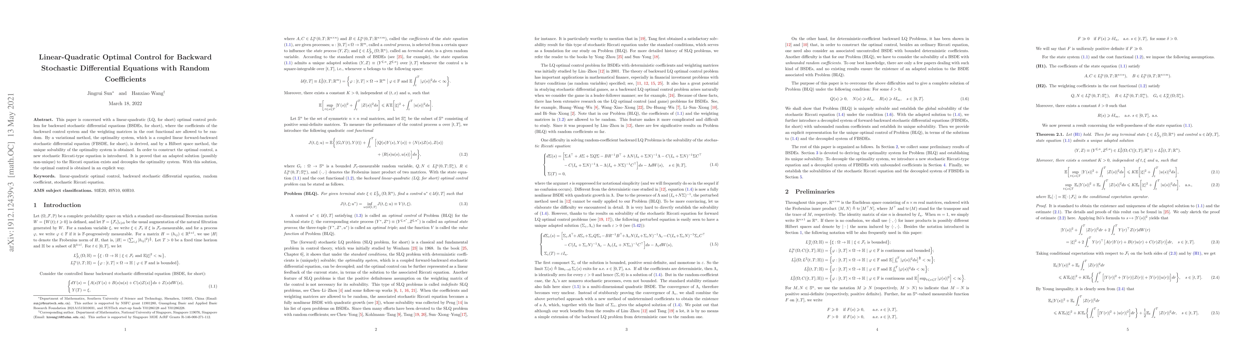 This paper investigates a linear-quadratic optimal control problem for backward stochastic differential equations with random coefficients, deriving an optimality system via variational methods and proving unique solvability through Hilbert space techniques. It introduces a new stochastic Riccati-type equation to construct the optimal control explicitly.