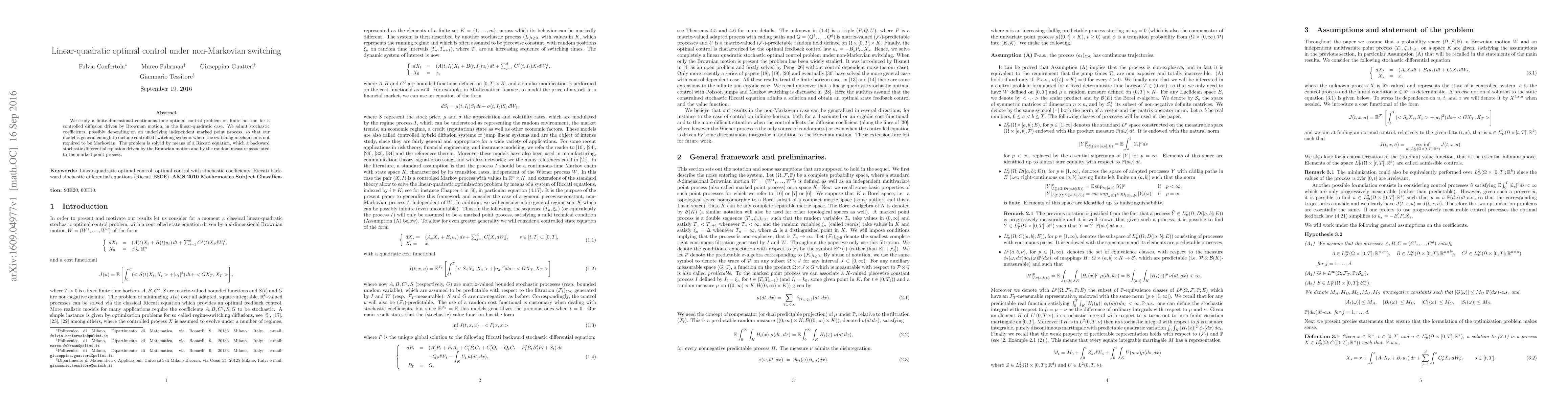 We study a finite-dimensional continuous-time optimal control problem on finite horizon for a controlled diffusion driven by Brownian motion, in the linear-quadratic case. We admit stochastic coefficients, possibly depending on an underlying independent marked point process, so that our model is general enough to include controlled switching systems where the switching mechanism is not required to be Markovian. The problem is solved by means of a Riccati equation, which a backward stochastic differential equation driven by the Bronwian motion and by the random measure associated to the marked point process.