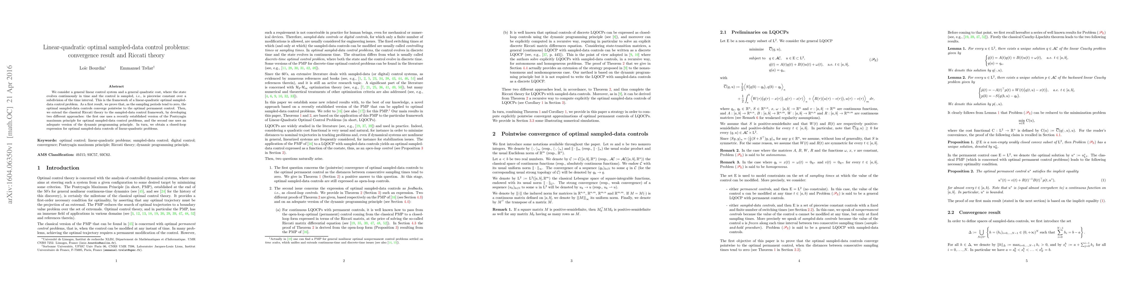 This paper explores linear-quadratic optimal sampled-data control problems, proving convergence of optimal sampled-data controls to permanent control as sampling periods shrink. It extends classical Riccati theory to this framework, utilizing both the Pontryagin maximum principle and dynamic programming to derive closed-loop expressions for optimal controls.