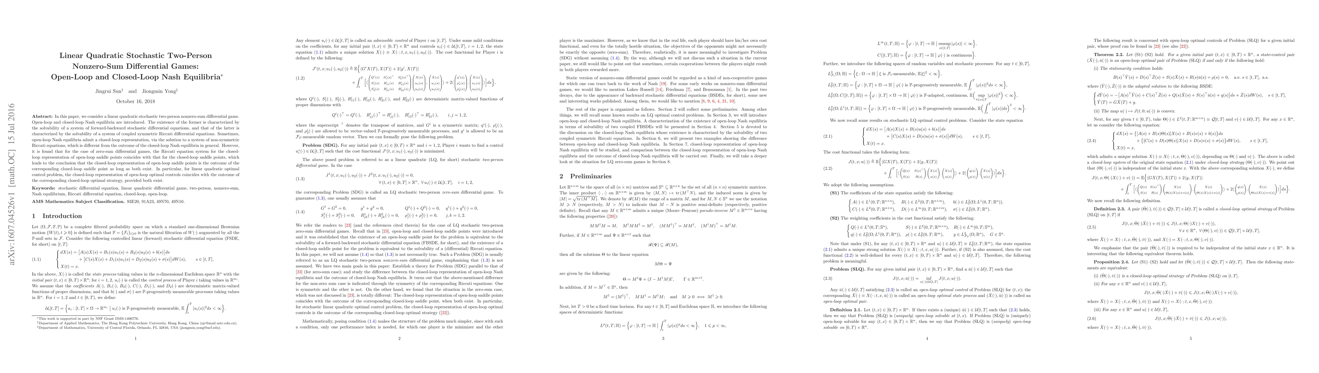 This paper investigates linear quadratic stochastic two-person nonzero-sum differential games, exploring both open-loop and closed-loop Nash equilibria. It finds that open-loop equilibria can sometimes be represented in closed-loop form, but this representation differs generally from true closed-loop equilibria, except in zero-sum cases where the Riccati equations align.