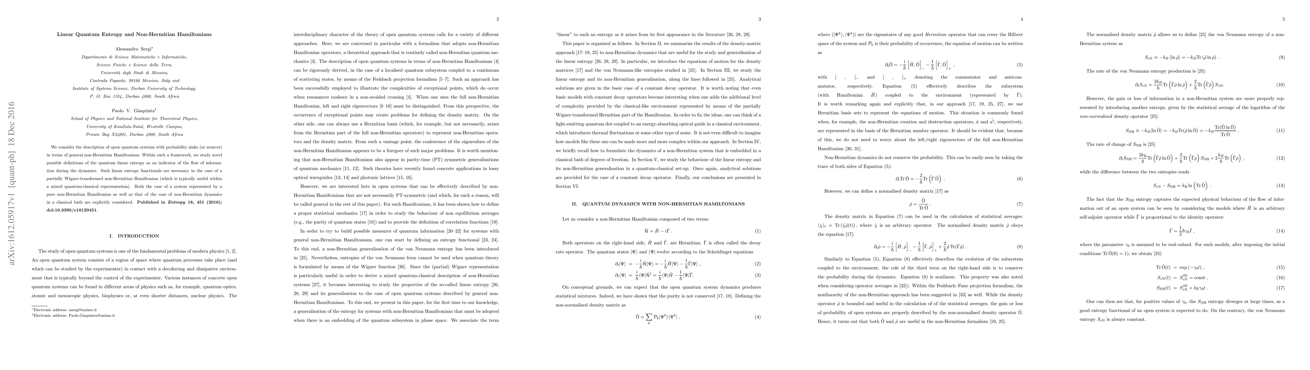 This paper explores the use of non-Hermitian Hamiltonians to describe open quantum systems with information sinks or sources, proposing new definitions of quantum linear entropy to measure information flow. It also examines these entropy functionals in both pure non-Hermitian Hamiltonian systems and those influenced by a classical bath.
