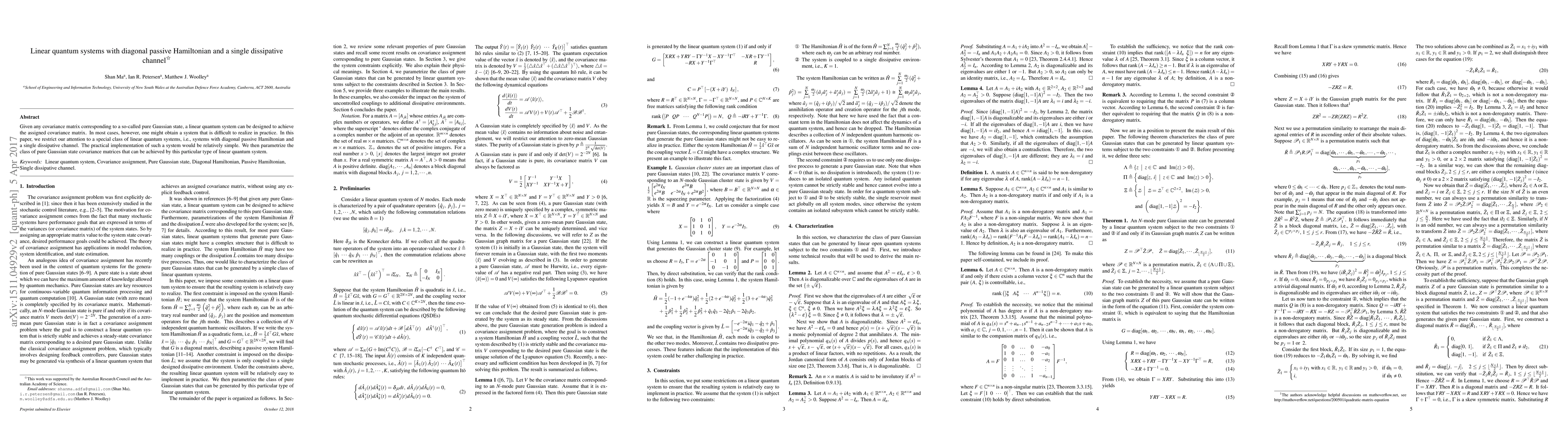 This paper explores linear quantum systems with a diagonal passive Hamiltonian and a single dissipative channel, focusing on their practical implementation simplicity. It also provides a parametrization of the pure Gaussian state covariance matrices that can be achieved by such systems.