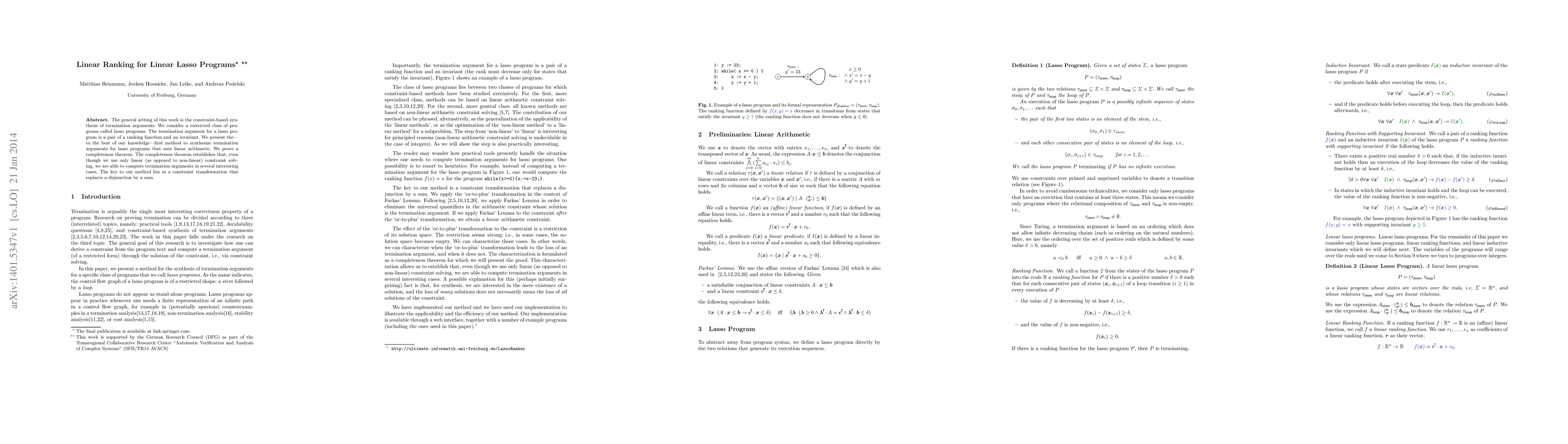 This paper introduces a novel linear ranking method for synthesizing termination arguments for lasso programs using linear arithmetic, proving a completeness theorem that demonstrates the effectiveness of linear constraints over non-linear ones in computing termination arguments. The method's success hinges on a constraint transformation that replaces disjunctions with sums.