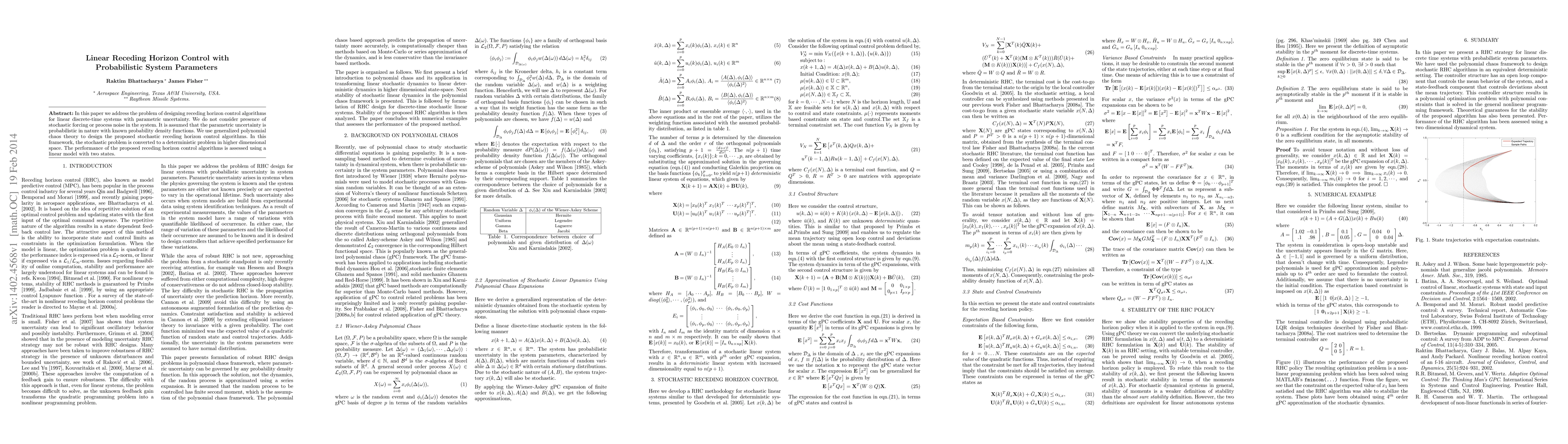 This paper proposes receding horizon control algorithms for linear systems with probabilistic parametric uncertainty, utilizing generalized polynomial chaos theory to convert the stochastic problem into a deterministic one. The effectiveness of the algorithms is demonstrated using a linear model with two states.