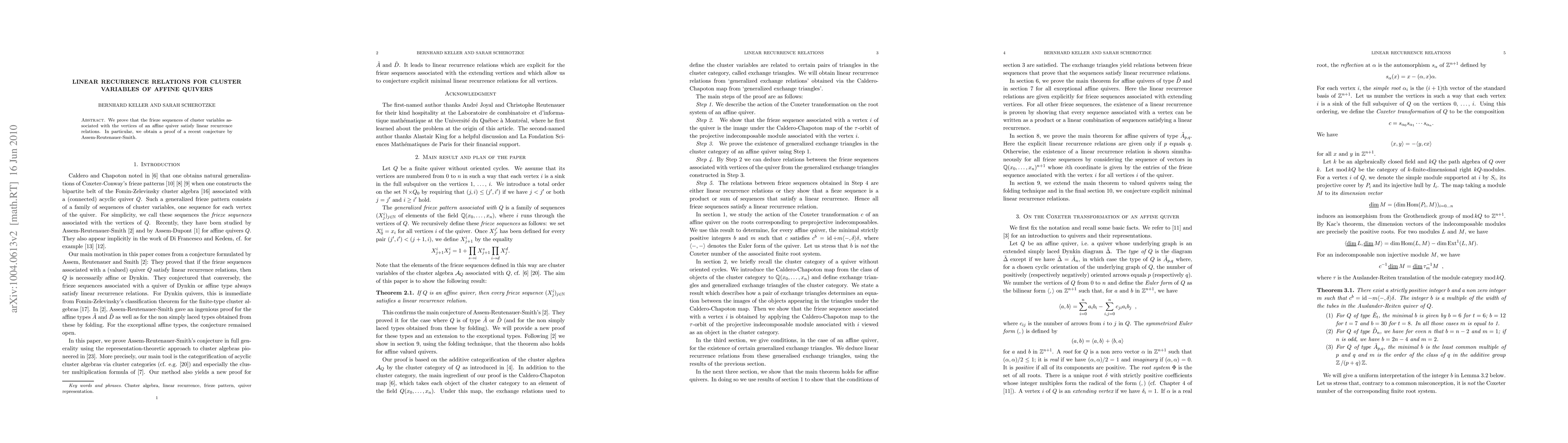 This paper proves that the cluster variables of an affine quiver follow linear recurrence relations, specifically addressing the frieze sequences, and confirms a recent conjecture proposed by Assem, Reutenauer, and Smith.