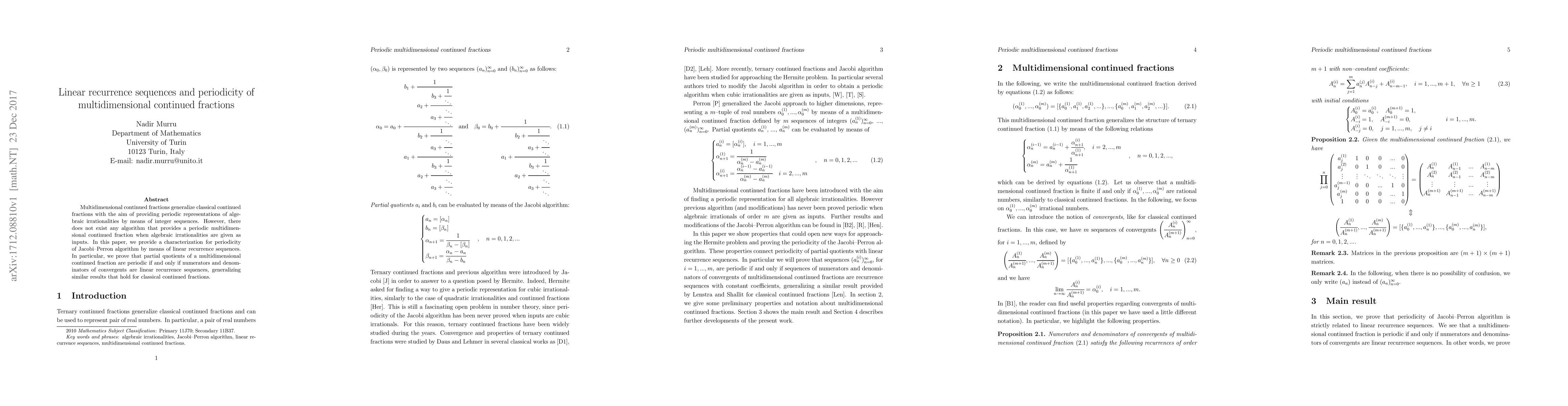 This paper characterizes the periodicity of multidimensional continued fractions via linear recurrence sequences. It proves that the partial quotients form a periodic sequence if and only if the numerators and denominators of convergents follow linear recurrence sequences, extending similar results known for classical continued fractions.