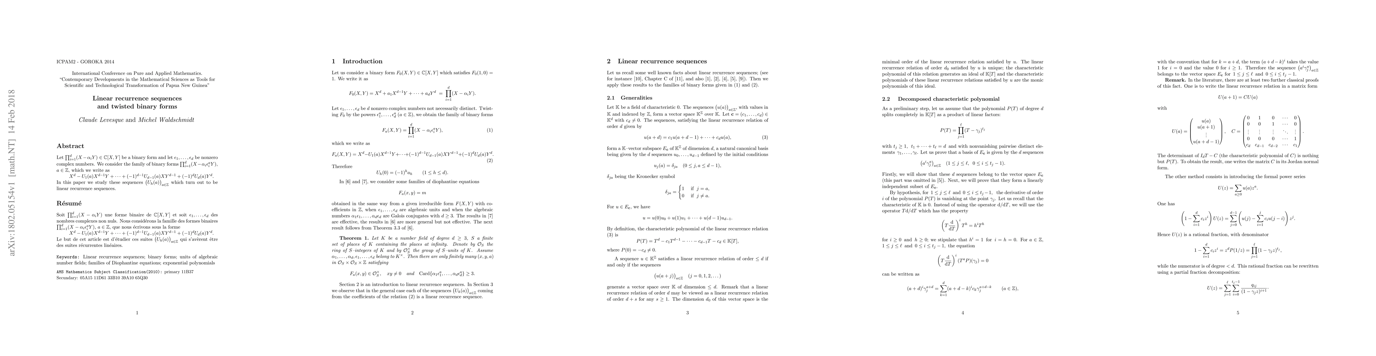 This paper investigates binary forms transformed by twisting factors $\epsilon_i$, resulting in sequences $\bigl(U_h(a)\bigr)_{a\in {\mathbb Z}}$ that exhibit linear recurrence behavior. The study focuses on the properties and implications of these recurrence sequences.