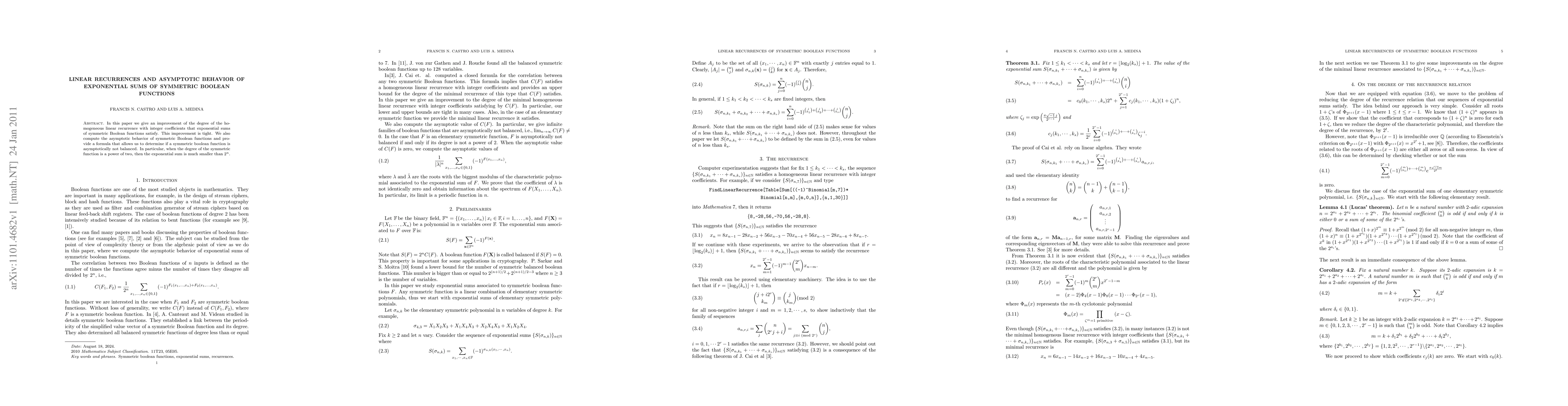 In this paper we give an improvement of the degree of the homogeneous linear recurrence with integer coefficients that exponential sums of symmetric Boolean functions satisfy. This improvement is tight. We also compute the asymptotic behavior of symmetric Boolean functions and provide a formula that allows us to determine if a symmetric boolean function is asymptotically not balanced. In particular, when the degree of the symmetric function is a power of two, then the exponential sum is much smaller than $2^n$.