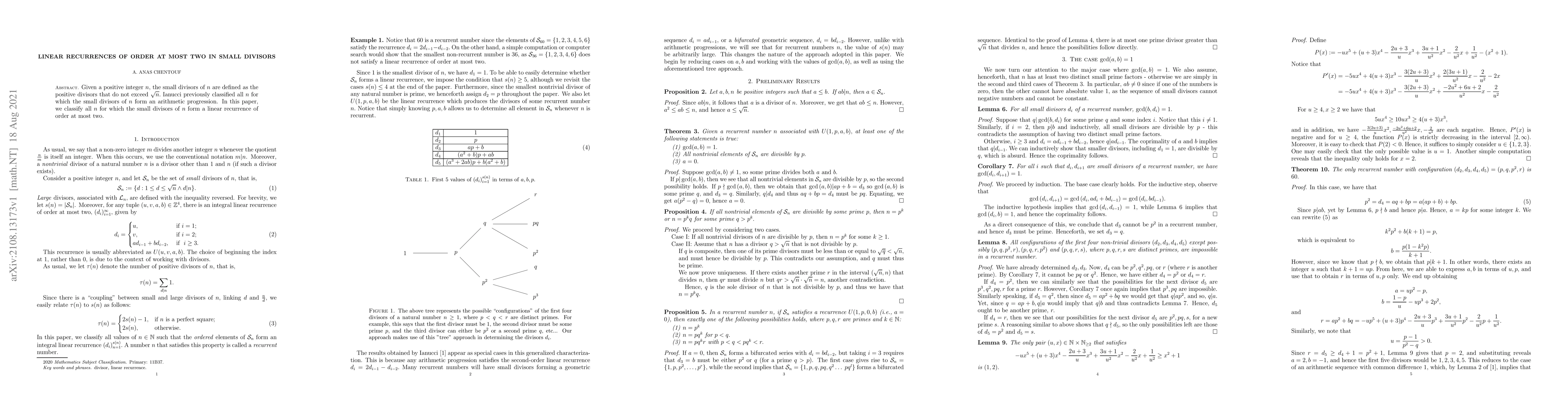 This paper classifies all positive integers $n$ for which the small divisors of $n$ (divisors not exceeding $\sqrt{n}$) form a sequence defined by a linear recurrence relation of order at most two, extending previous work on arithmetic progressions of small divisors.
