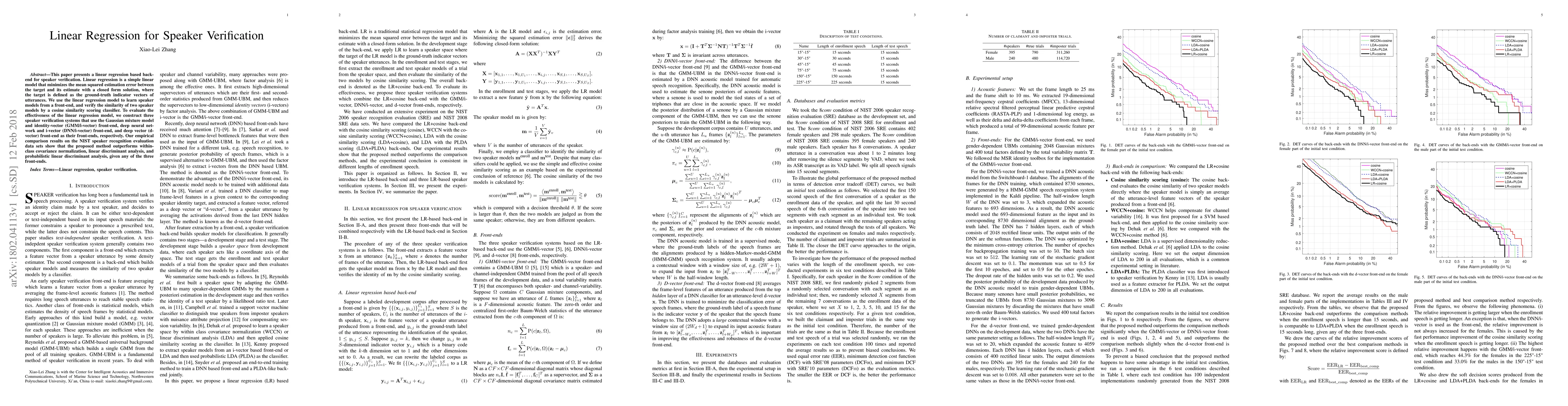 The paper presents a linear regression model for speaker verification that minimizes mean squared estimation error, providing a closed-form solution for learning speaker models and evaluating speaker similarity.