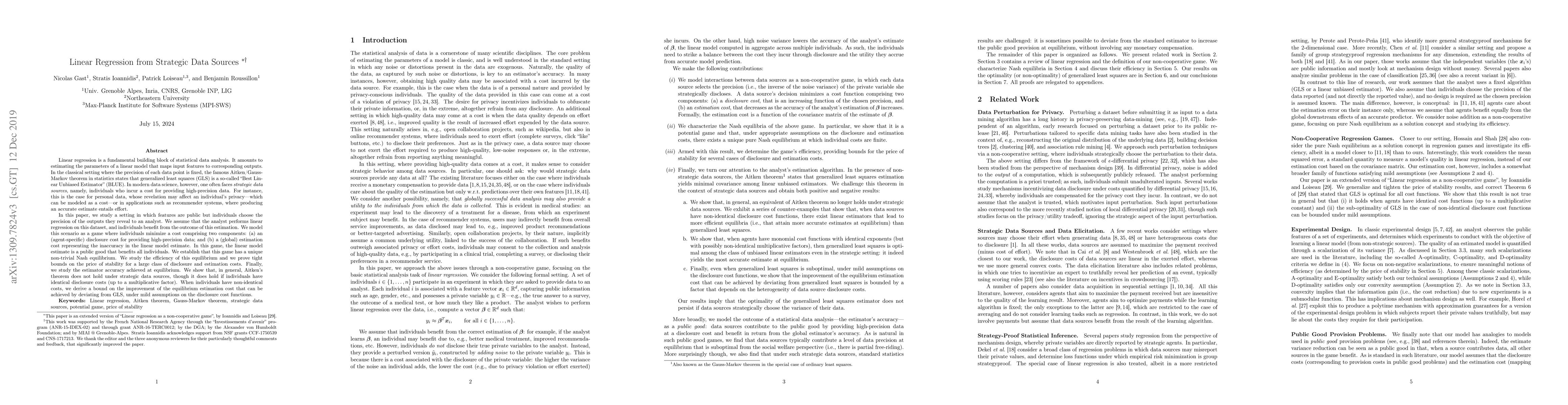 Linear regression is a fundamental building block of statistical data analysis. It amounts to estimating the parameters of a linear model that maps input features to corresponding outputs. In the classical setting where the precision of each data point is fixed, the famous Aitken/Gauss-Markov theorem in statistics states that generalized least squares (GLS) is a so-called "Best Linear Unbiased Estimator" (BLUE). In modern data science, however, one often faces strategic data sources, namely, individuals who incur a cost for providing high-precision data. In this paper, we study a setting in which features are public but individuals choose the precision of the outputs they reveal to an analyst. We assume that the analyst performs linear regression on this dataset, and individuals benefit from the outcome of this estimation. We model this scenario as a game where individuals minimize a cost comprising two components: (a) an (agent-specific) disclosure cost for providing high-precision data; and (b) a (global) estimation cost representing the inaccuracy in the linear model estimate. In this game, the linear model estimate is a public good that benefits all individuals. We establish that this game has a unique non-trivial Nash equilibrium. We study the efficiency of this equilibrium and we prove tight bounds on the price of stability for a large class of disclosure and estimation costs. Finally, we study the estimator accuracy achieved at equilibrium. We show that, in general, Aitken's theorem does not hold under strategic data sources, though it does hold if individuals have identical disclosure costs (up to a multiplicative factor). When individuals have non-identical costs, we derive a bound on the improvement of the equilibrium estimation cost that can be achieved by deviating from GLS, under mild assumptions on the disclosure cost functions.