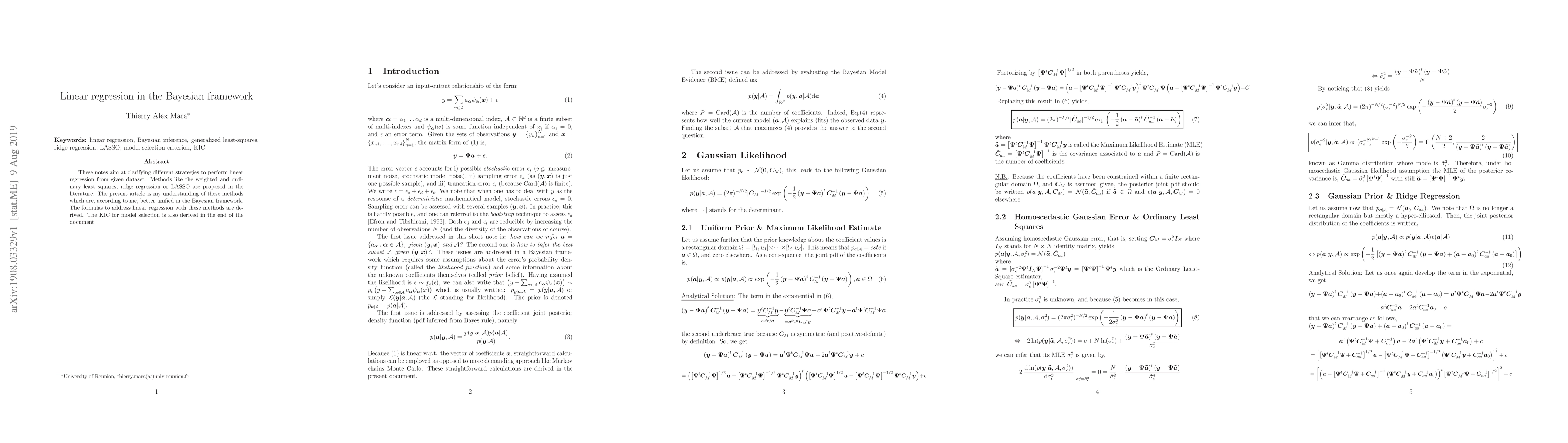 These notes aim at clarifying different strategies to perform linear regression from given dataset. Methods like the weighted and ordinary least squares, ridge regression or LASSO are proposed in the literature. The present article is my understanding of these methods which are, according to me, better unified in the Bayesian framework. The formulas to address linear regression with these methods are derived. The KIC for model selection is also derived in the end of the document.