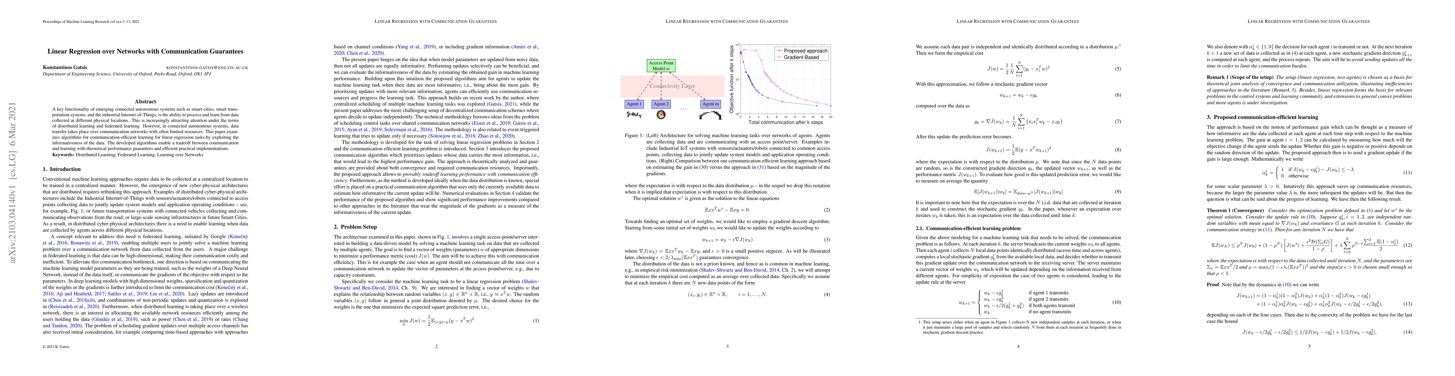 This paper presents communication-efficient algorithms for distributed linear regression in resource-limited networks, crucial for autonomous systems like smart cities. It offers theoretical guarantees and practical implementations balancing communication costs and learning performance.