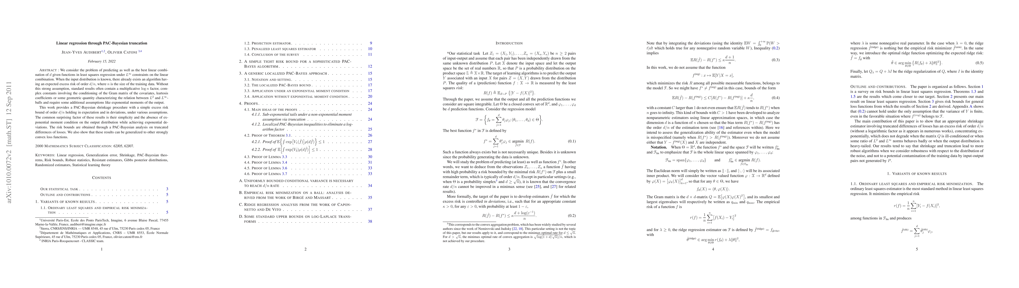 We consider the problem of predicting as well as the best linear combination of d given functions in least squares regression under L^\infty constraints on the linear combination. When the input distribution is known, there already exists an algorithm having an expected excess risk of order d/n, where n is the size of the training data. Without this strong assumption, standard results often contain a multiplicative log(n) factor, complex constants involving the conditioning of the Gram matrix of the covariates, kurtosis coefficients or some geometric quantity characterizing the relation between L^2 and L^\infty-balls and require some additional assumptions like exponential moments of the output. This work provides a PAC-Bayesian shrinkage procedure with a simple excess risk bound of order d/n holding in expectation and in deviations, under various assumptions. The common surprising factor of these results is their simplicity and the absence of exponential moment condition on the output distribution while achieving exponential deviations. The risk bounds are obtained through a PAC-Bayesian analysis on truncated differences of losses. We also show that these results can be generalized to other strongly convex loss functions.